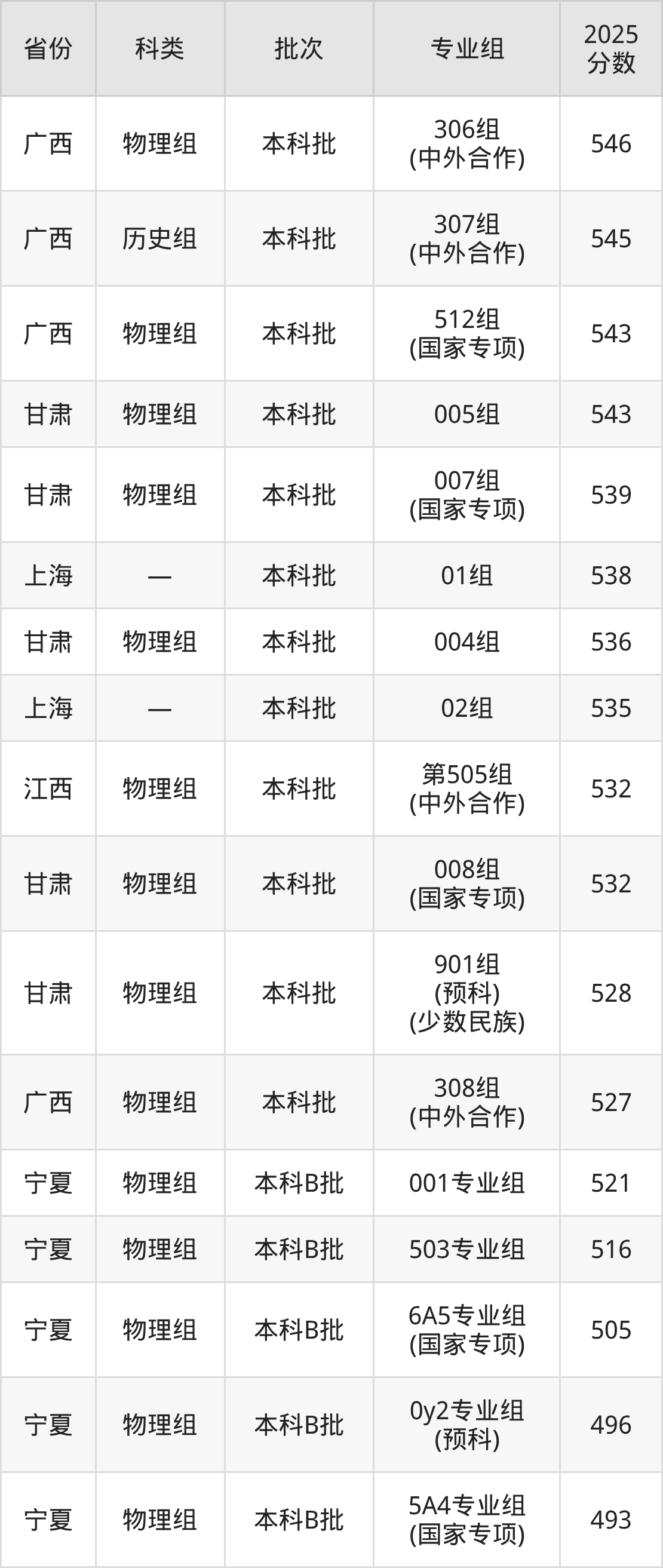 华中农业大学在省外招生的最低分为493分,其次是广西物理组考生,上华中农业大学至少要超本科线157分(527分)。