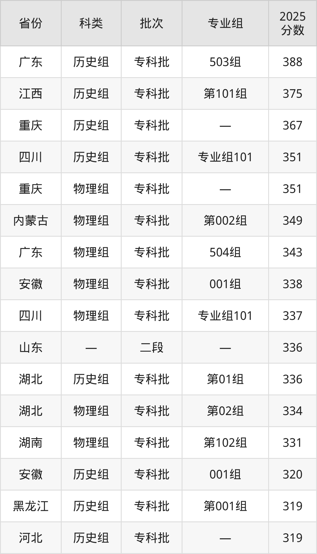 而广东地区历史组考生的分数门槛最高,2025年河北旅游职业学院503组在广东招生最低分为388分,考生至少要超专科线173分才有可能被录取。