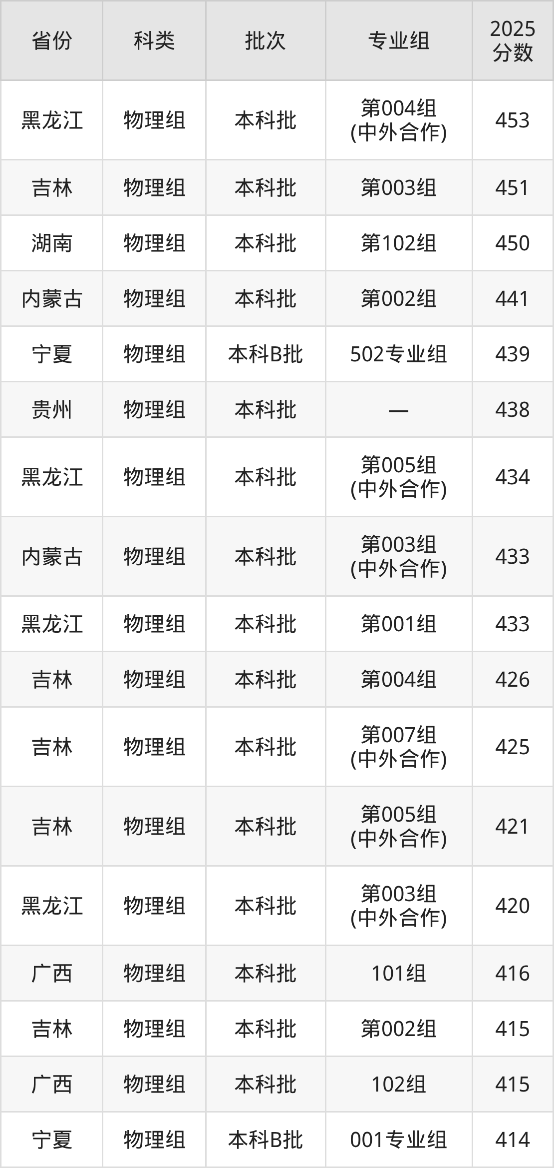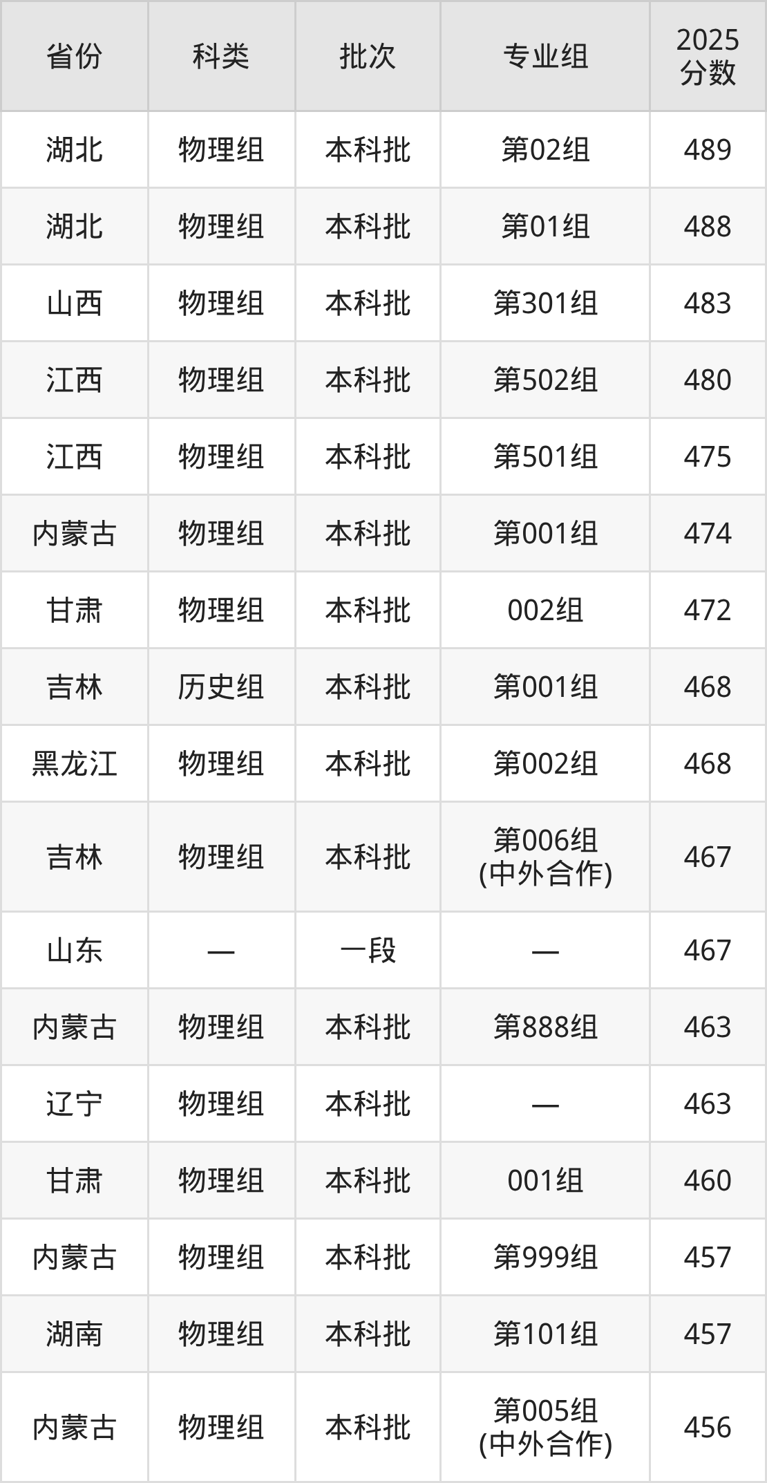 2025年吉林化工大学在全国普通批次招生的录取分数范围位于412~517分之间,其中省内分数范围为412分~468分,物理组最低分专业组为“第008组”,考生412分即可报考,历史组最低分专业组为“第001组”,考生468分即可报考。