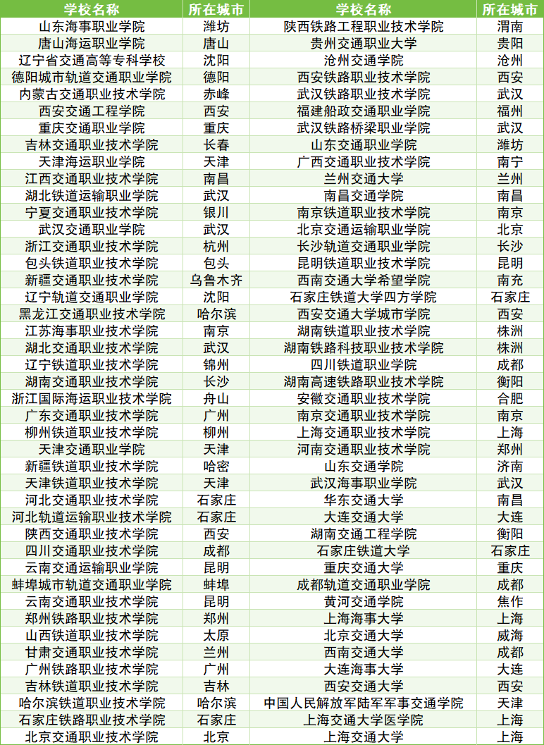 其中本科院校包含:沧州交通学院、南昌交通学院、沧州交通学院、沧州交通学院、兰州交通大学、山东交通学院等。