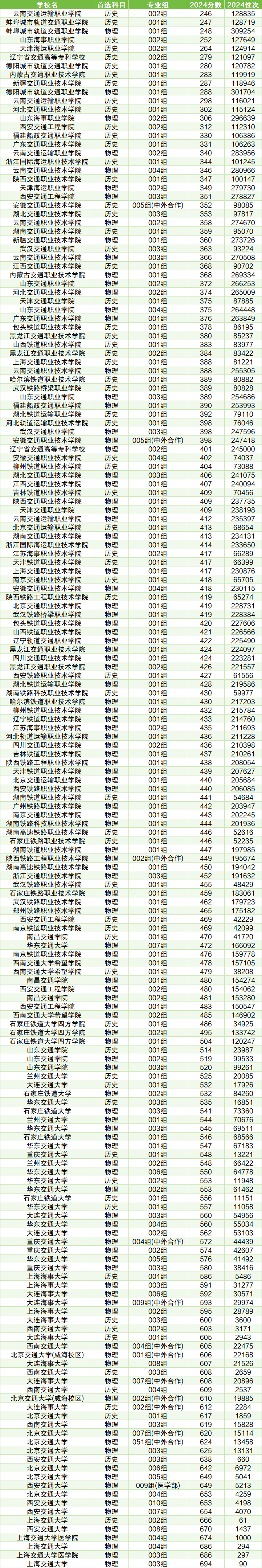 以历史类为例,考生可报考的最低分交通类大学有云南交通运输职业学院(002组),2024年最低分均为246分。