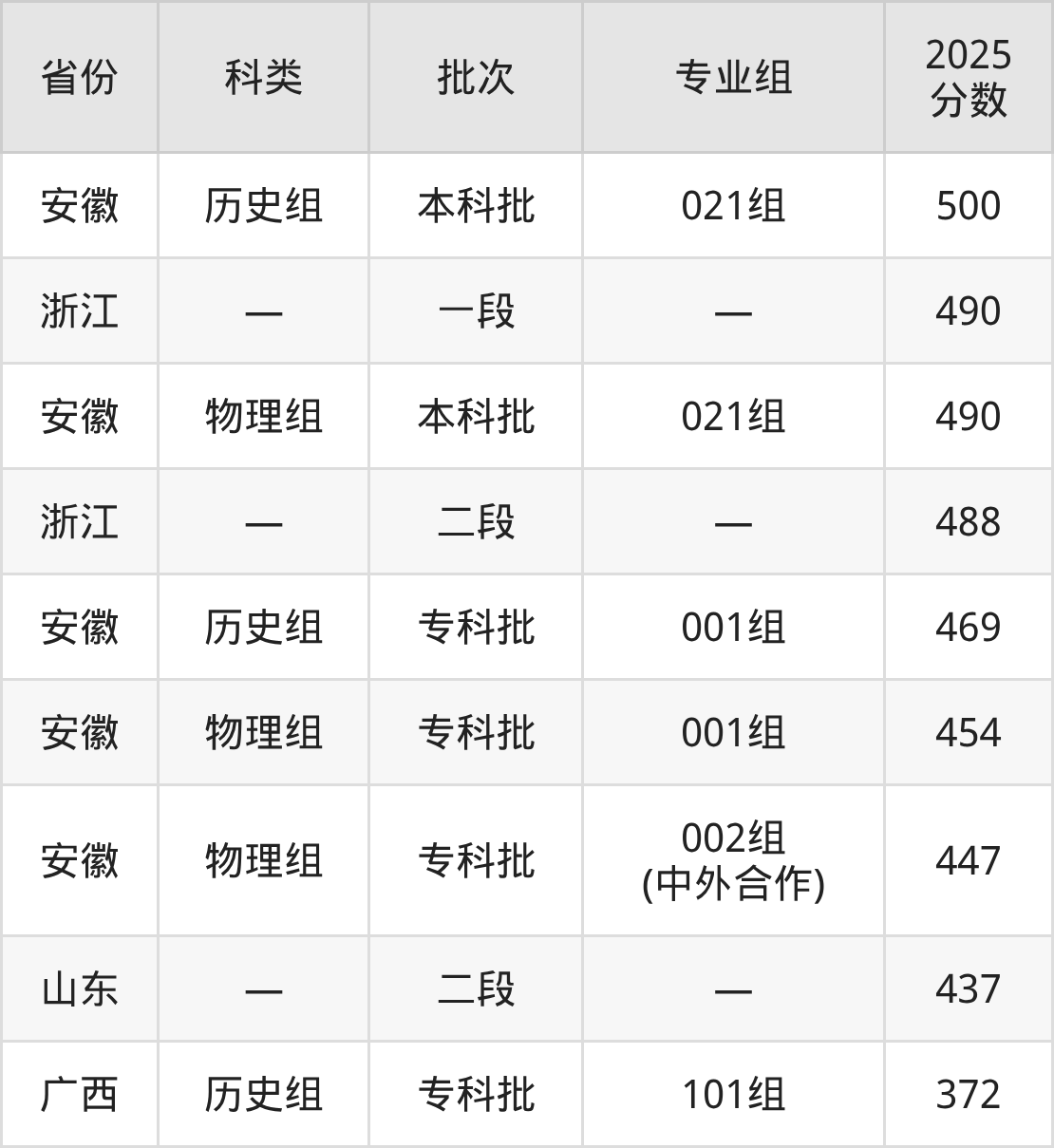 而浙江地区考生的分数门槛最高,2025年芜湖职业技术大学在浙江招生最低分为490分,考生至少要超一段线0分才有可能被录取。