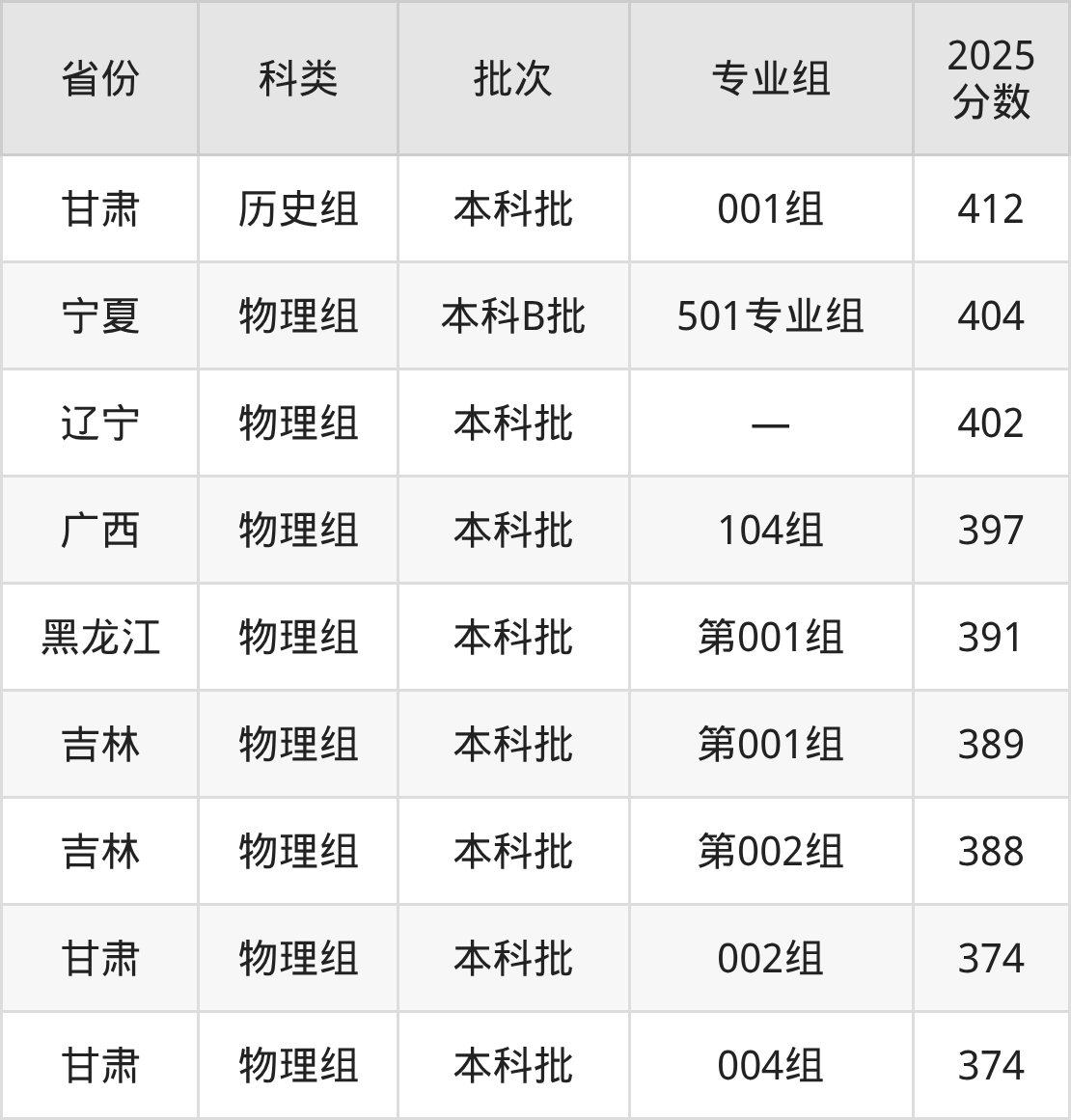 2025年兰州信息科技学院在全国普通批次招生的录取分数范围位于374~523分之间,其中省内分数范围为374分~412分,历史组最低分专业组为“001组”,考生412分即可报考,物理组最低分专业组为“002组”,考生374分即可报考。