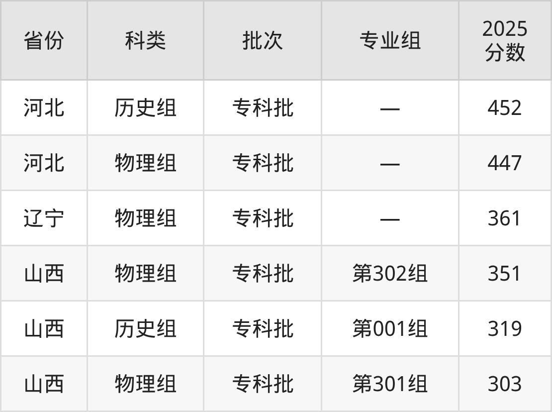 而河北地区历史组考生的分数门槛最高,2025年山西通用航空职业技术学院在河北招生最低分为452分,考生至少要超专科线252分才有可能被录取。