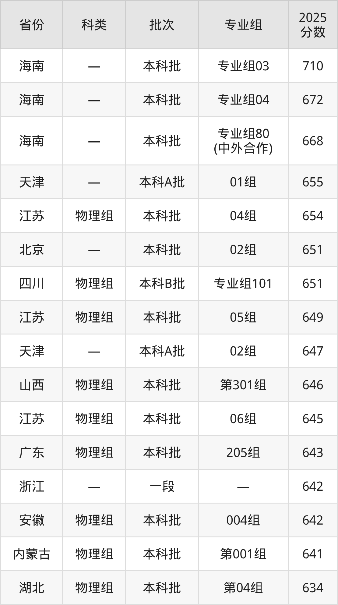 而海南地区考生的分数门槛最高,2025年南京航空航天大学专业组03在海南招生最低分为710分,考生至少要超本科线230分才有可能被录取。