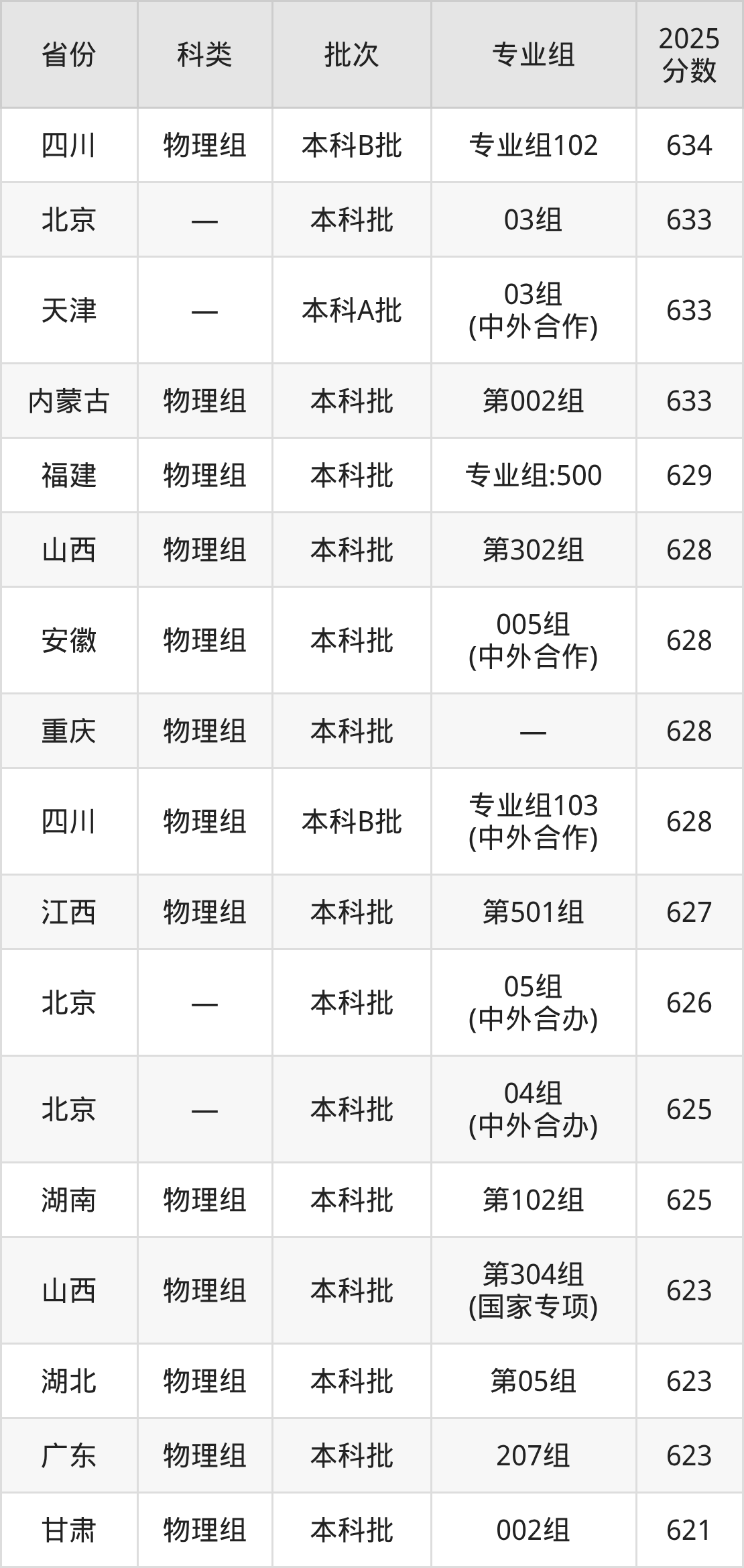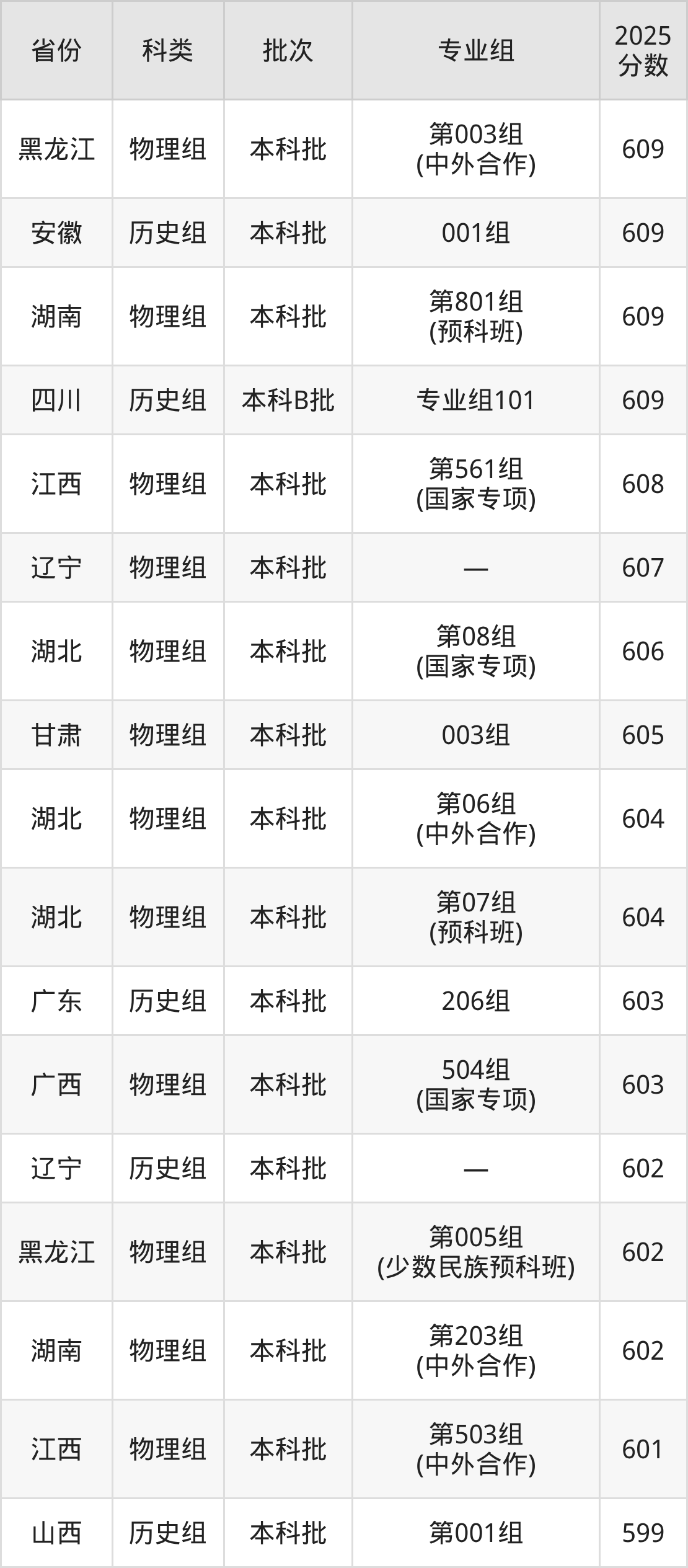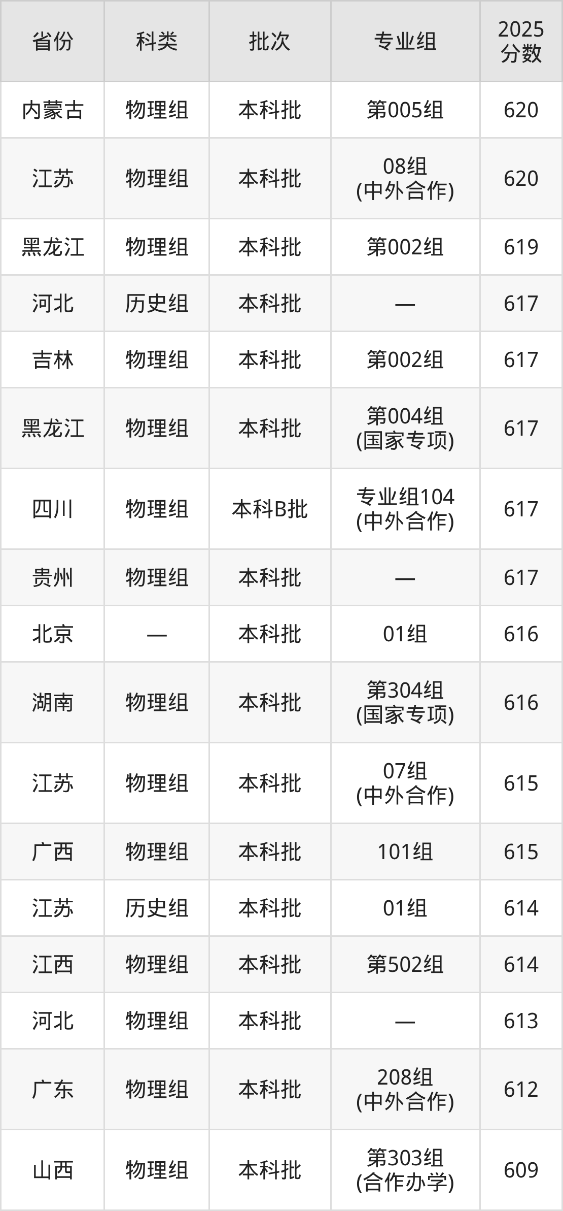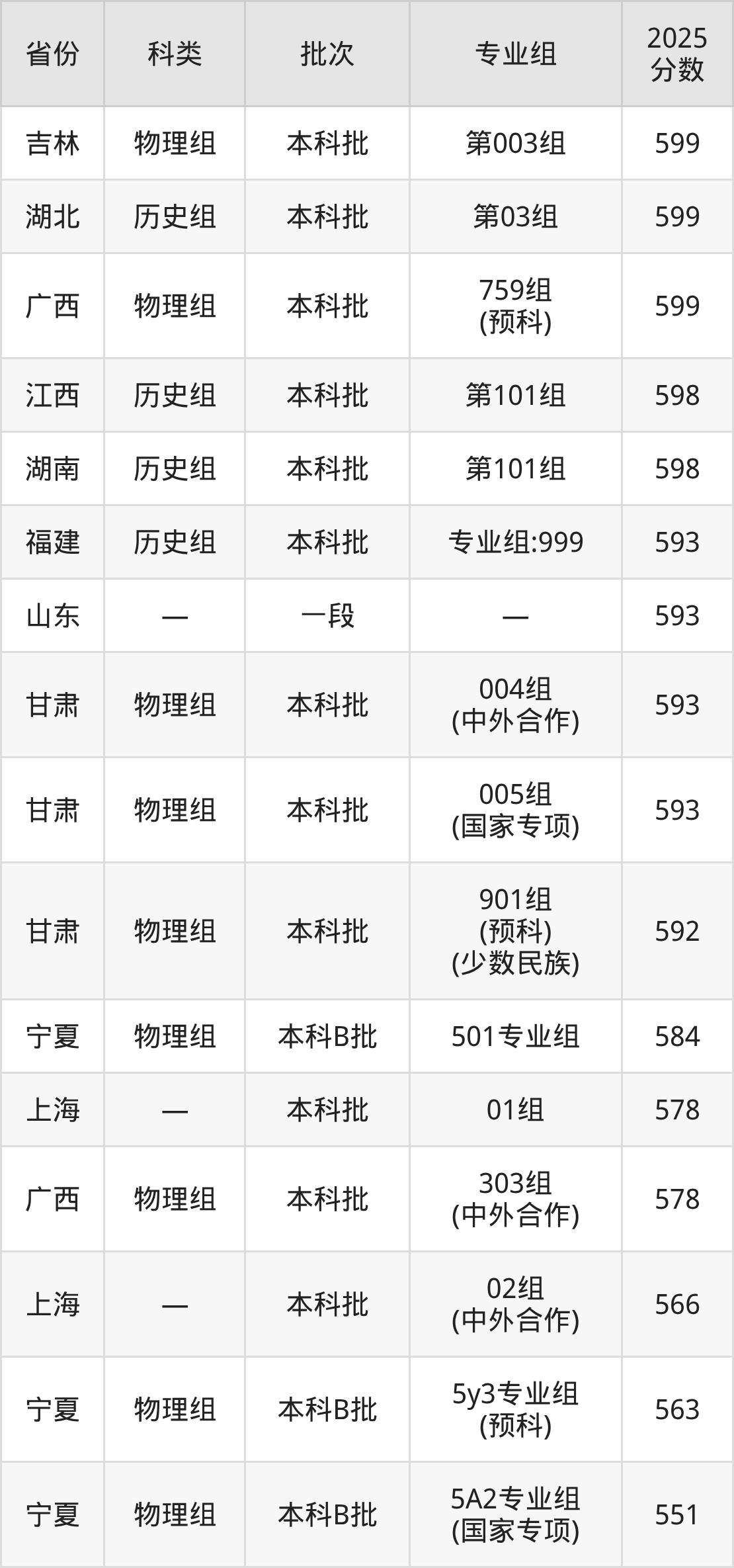 2025年南京航空航天大学在全国普通批次招生的录取分数范围位于551~710分之间,其中省内分数范围为614分~654分,历史组最低分专业组为“01组”,考生614分即可报考,物理组最低分专业组为“07组(中外合作)”,考生615分即可报考。