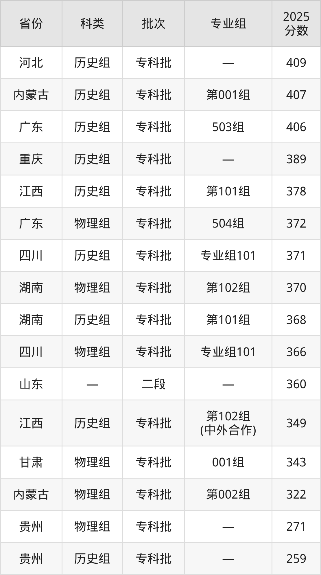 而河北地区历史组考生的分数门槛最高,2025年抚州职业技术学院在河北招生最低分为409分,考生至少要超专科线209分才有可能被录取。
