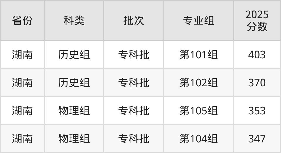 2025年湖南工艺美术职业学院在全国普通批次招生的录取分数范围位于347~403分之间,其中省内分数范围为347分~403分,物理组最低分专业组为“第104组”,考生347分即可报考,历史组最低分专业组为“第102组”,考生370分即可报考。