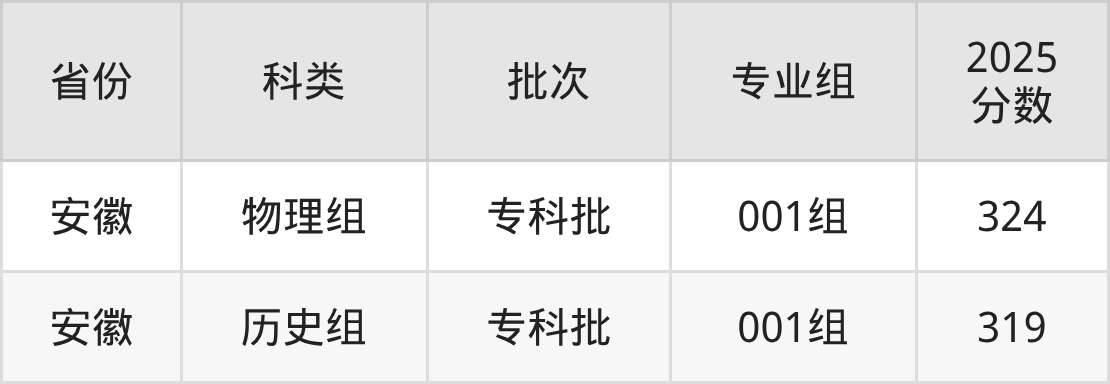 2025年芜湖医药健康职业学院在全国普通批次招生的录取分数范围位于319~324分之间,其中省内分数范围为319分~324分,物理组最低分专业组为“001组”,考生324分即可报考,历史组最低分专业组为“001组”,考生319分即可报考。