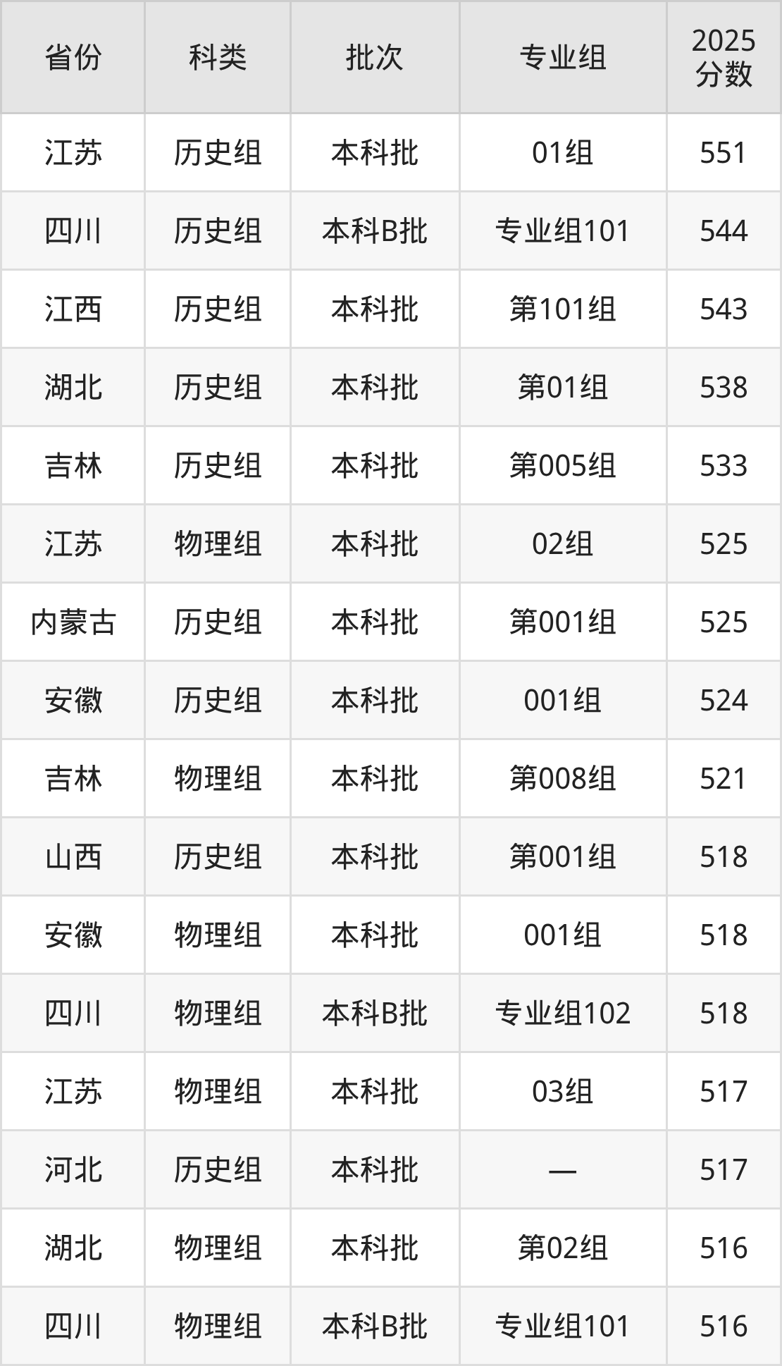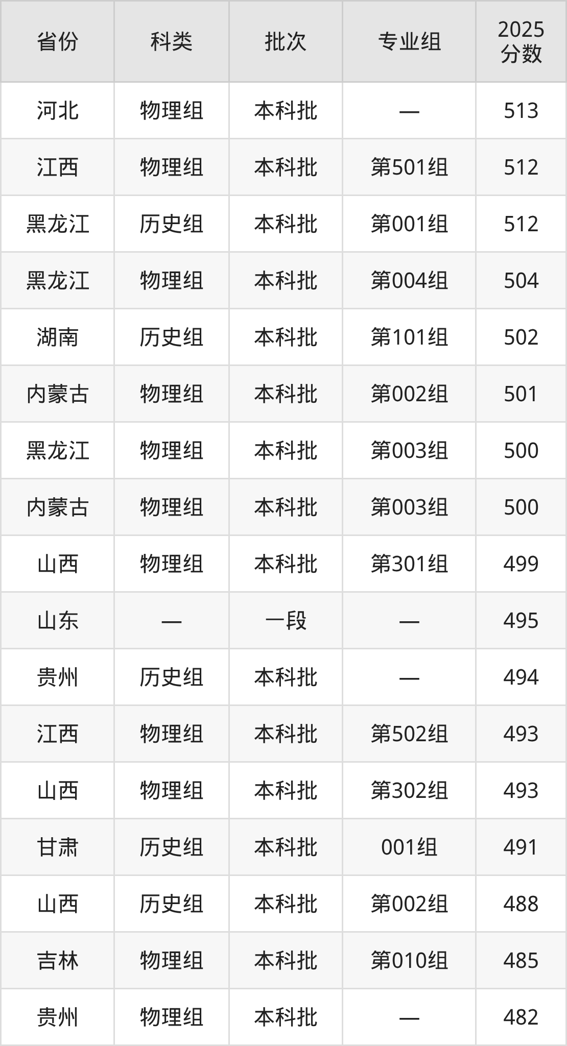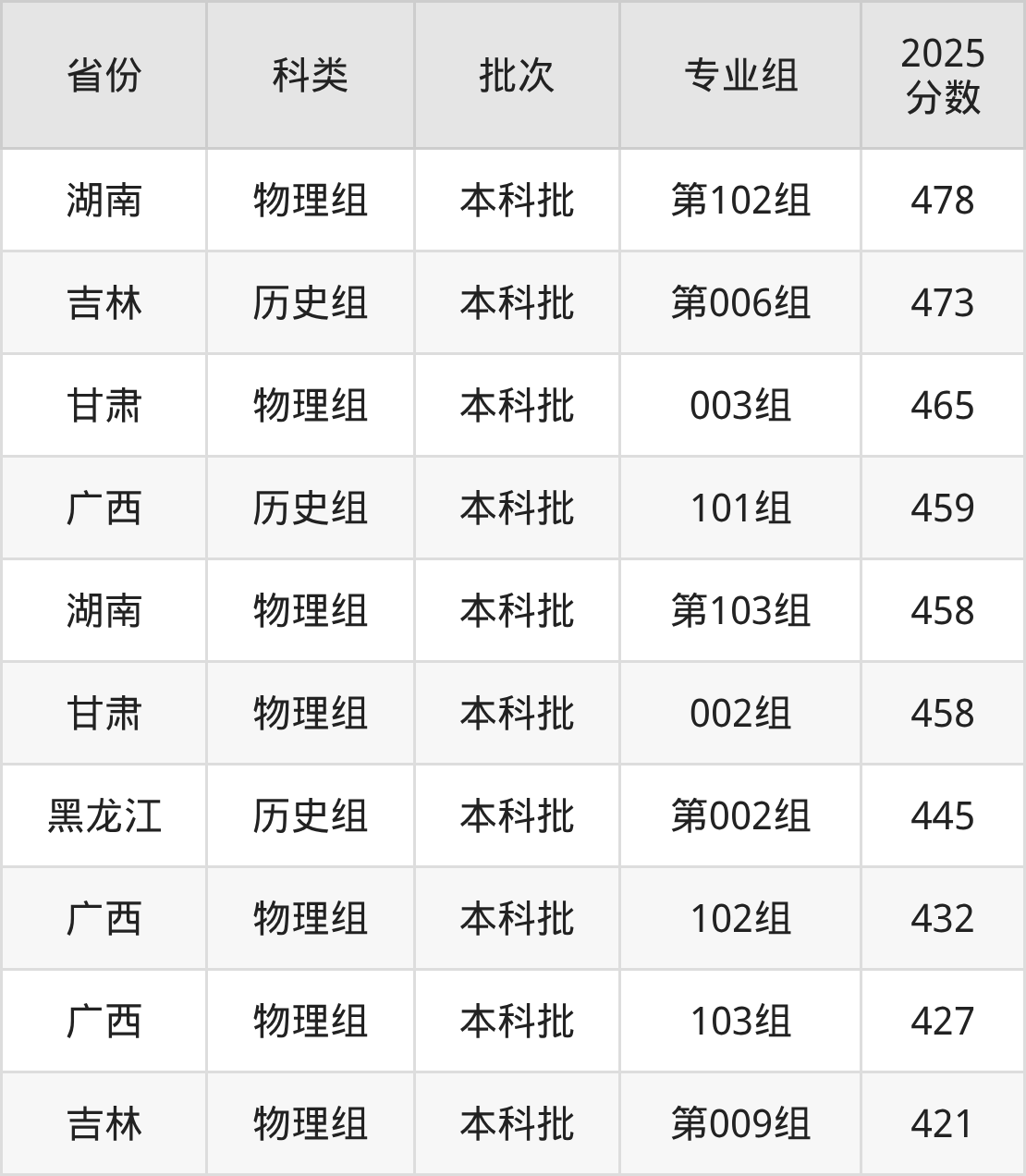 2025年吉林警察学院在全国普通批次招生的录取分数范围位于421~551分之间,其中省内分数范围为421分~533分,历史组最低分专业组为“第006组”,考生473分即可报考,物理组最低分专业组为“第009组”,考生421分即可报考。