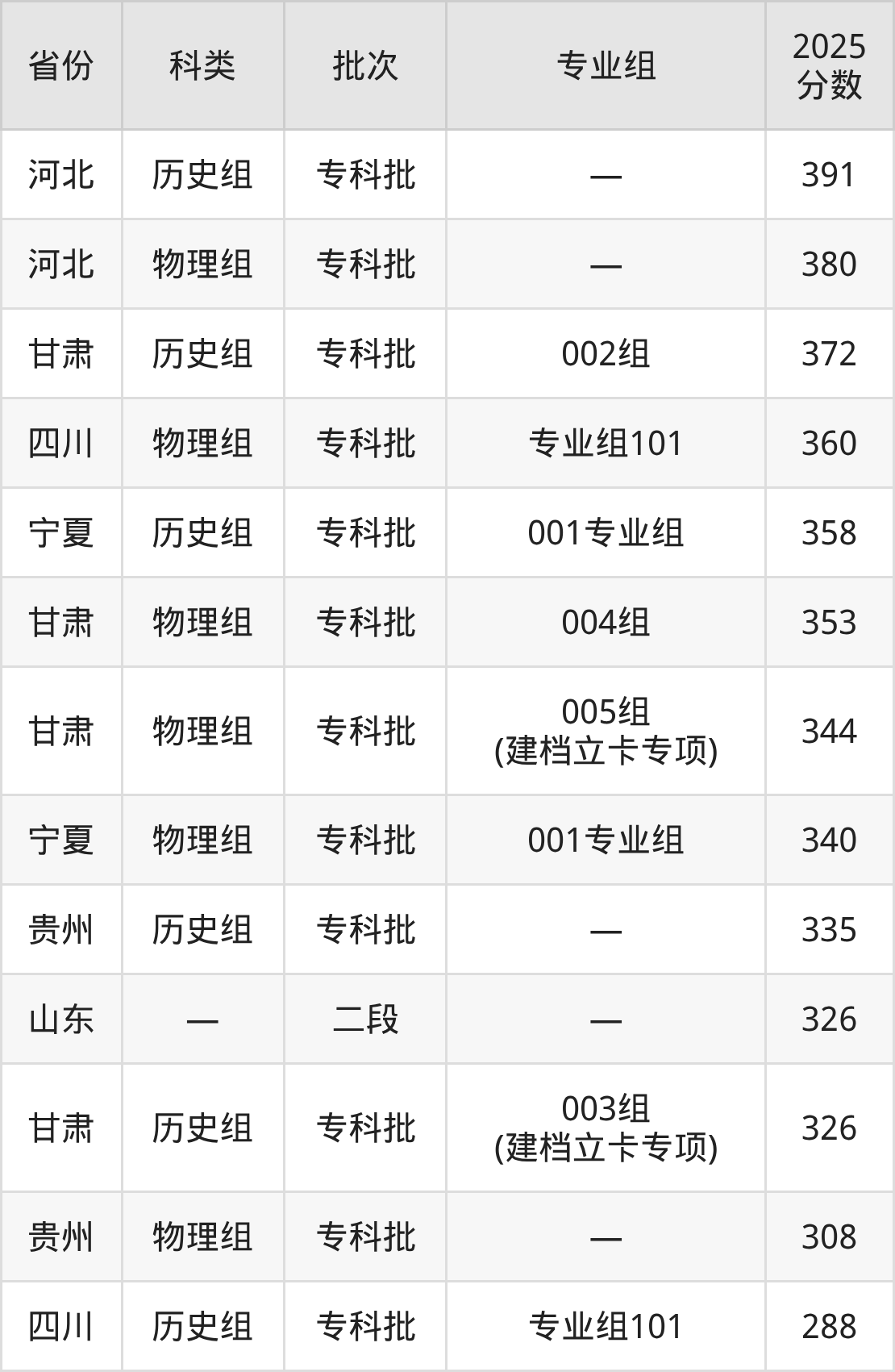 而河北地区历史组考生的分数门槛最高,2025年兰州职业技术学院在河北招生最低分为391分,考生至少要超专科线191分才有可能被录取。