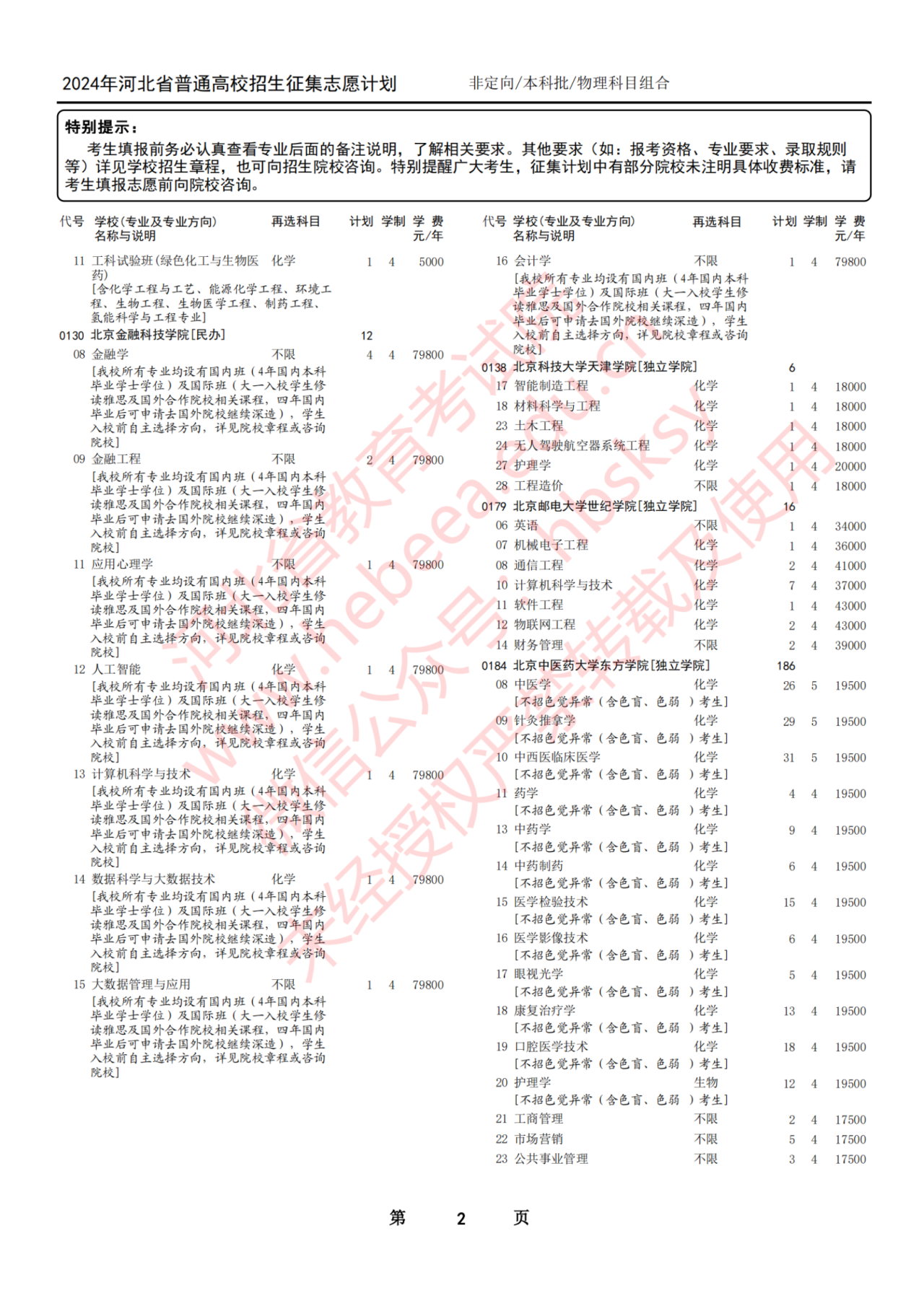 2024年河北省普通高校招生本科批第二次征集志愿计划