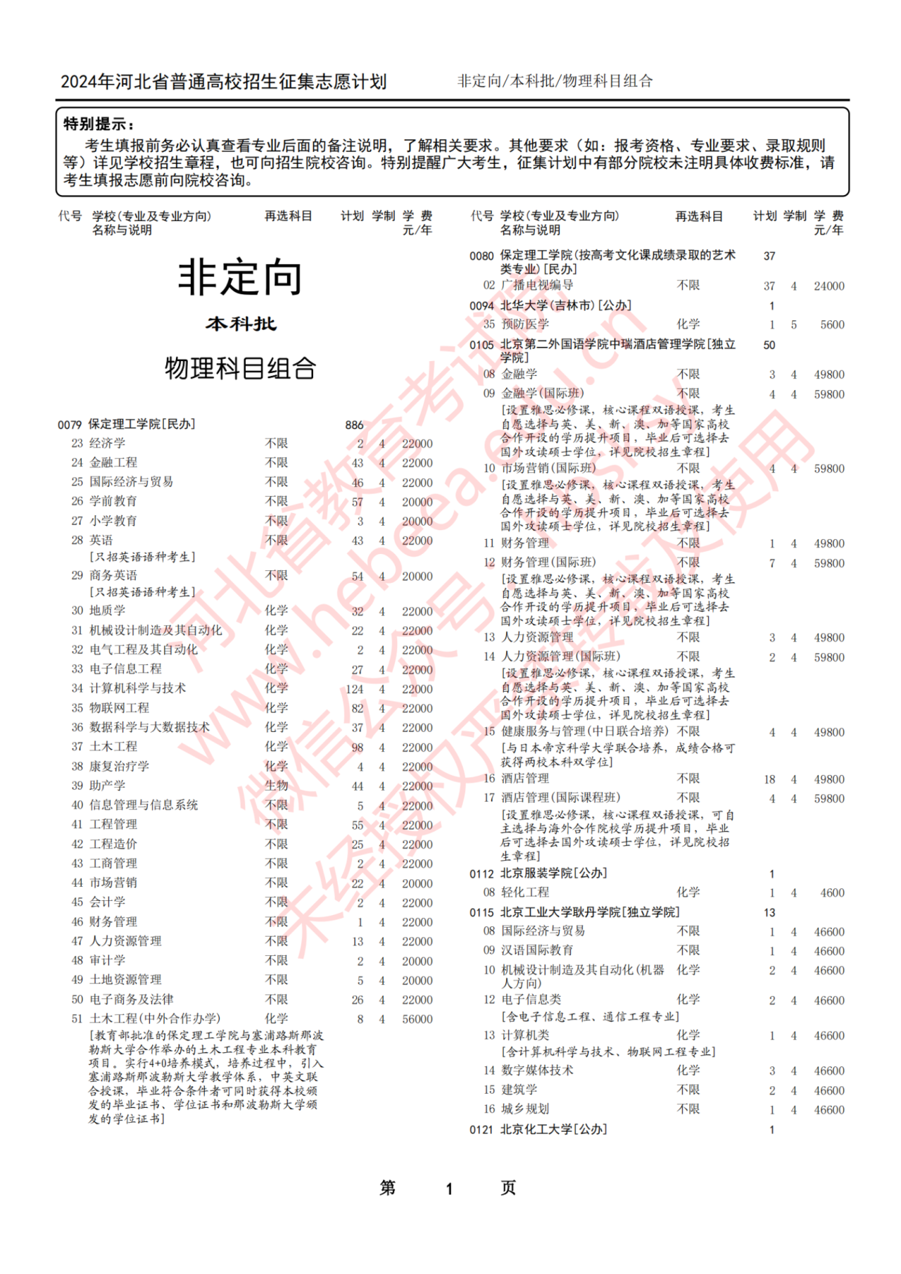 2024年河北省普通高校招生本科批第一次征集志愿计划