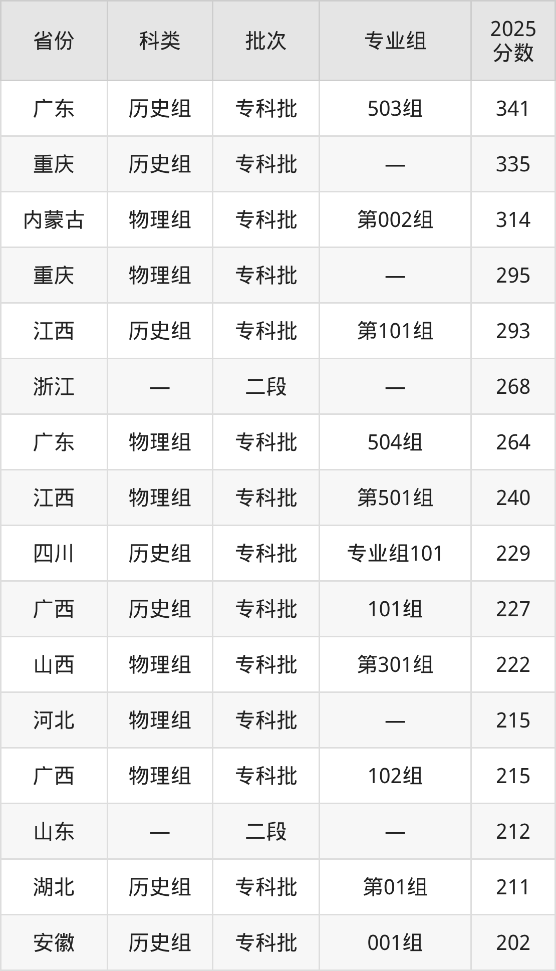 而广东地区历史组考生的分数门槛最高,2025年贵州民用航空职业学院503组在广东招生最低分为341分,考生至少要超专科线126分才有可能被录取。