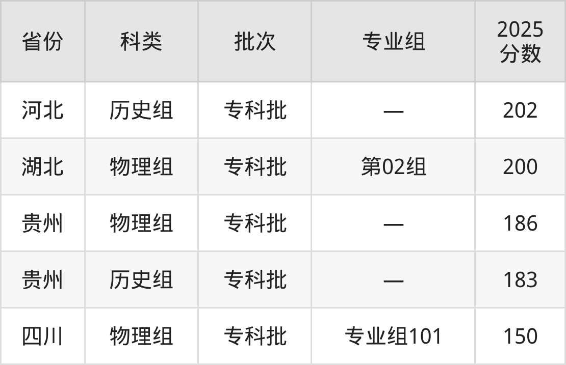 贵州民用航空职业学院在省外招生的最低分为150分,其中四川地区物理组考生上贵州民用航空职业学院的分数门槛最低,考生成绩达专科线即可报考。其次是湖北物理组考生,上贵州民用航空职业学院至少要超专科线0分(200分)。
