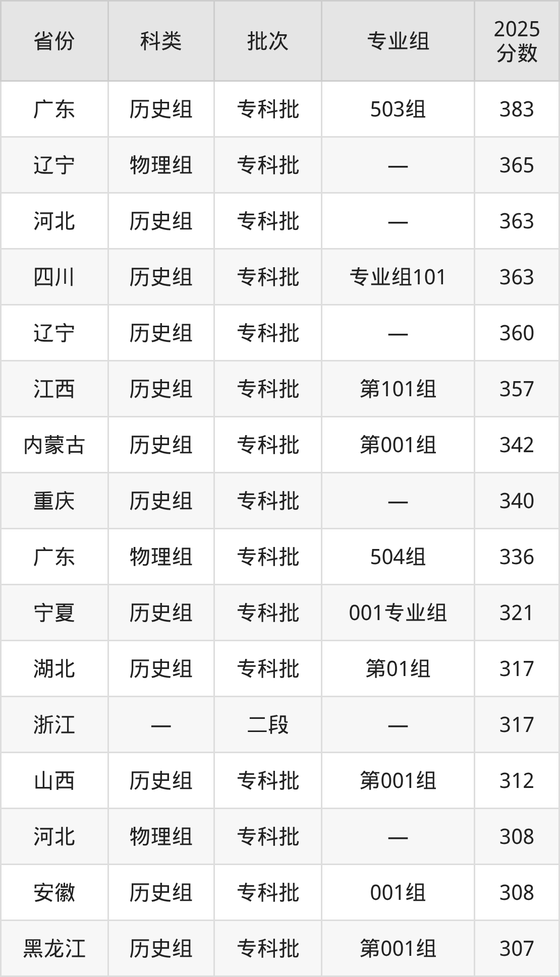 而广东地区历史组考生的分数门槛最高,2025年西安海棠职业学院503组在广东招生最低分为383分,考生至少要超专科线168分才有可能被录取。