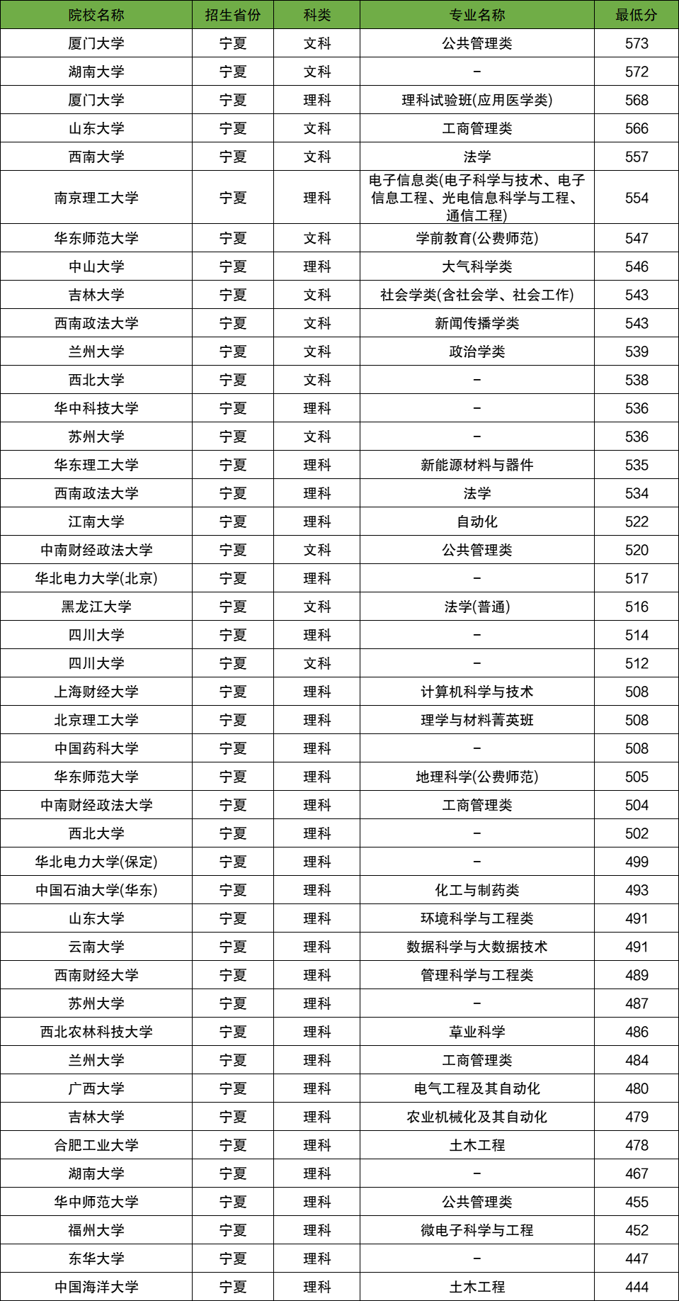 宁夏文科考生中较难考的大学有厦门大学、湖南大学、山东大学,对应最低分数线分别为573分、572分、566分。