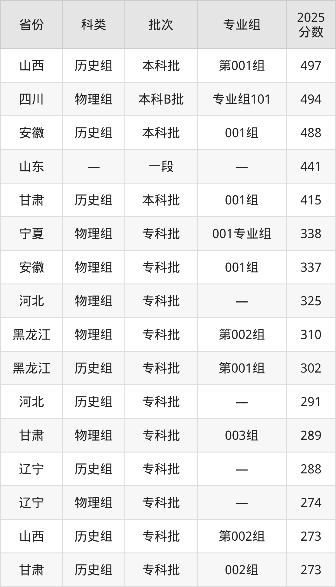 而山西地区历史组考生的分数门槛最高,2025年潍坊理工学院第001组在山西招生最低分为497分,考生至少要超本科线54分才有可能被录取。