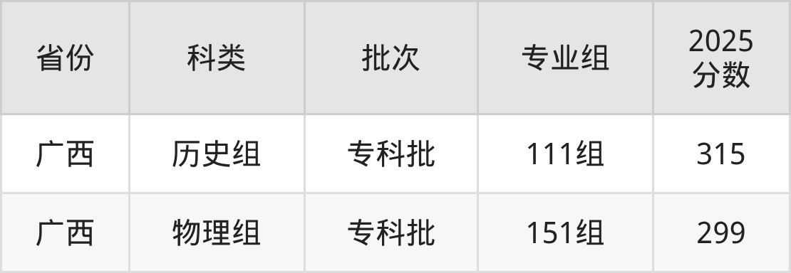 2025年玉林职业技术学院在全国普通批次招生的录取分数范围位于299~315分之间,其中壮族自治区内分数范围为299分~315分,历史组最低分专业组为“111组”,考生315分即可报考,物理组最低分专业组为“151组”,考生299分即可报考。