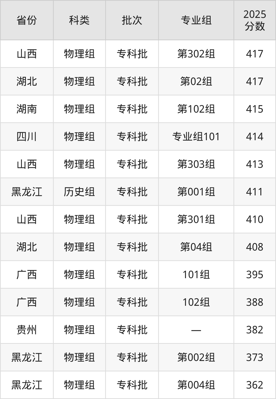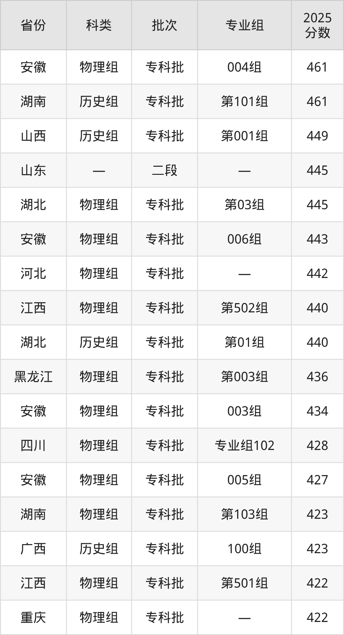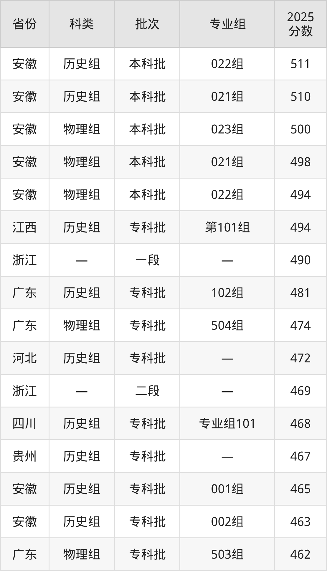 而江西地区历史组考生的分数门槛最高,2025年安徽第二医学院第101组在江西招生最低分为494分,考生至少要超专科线204分才有可能被录取。
