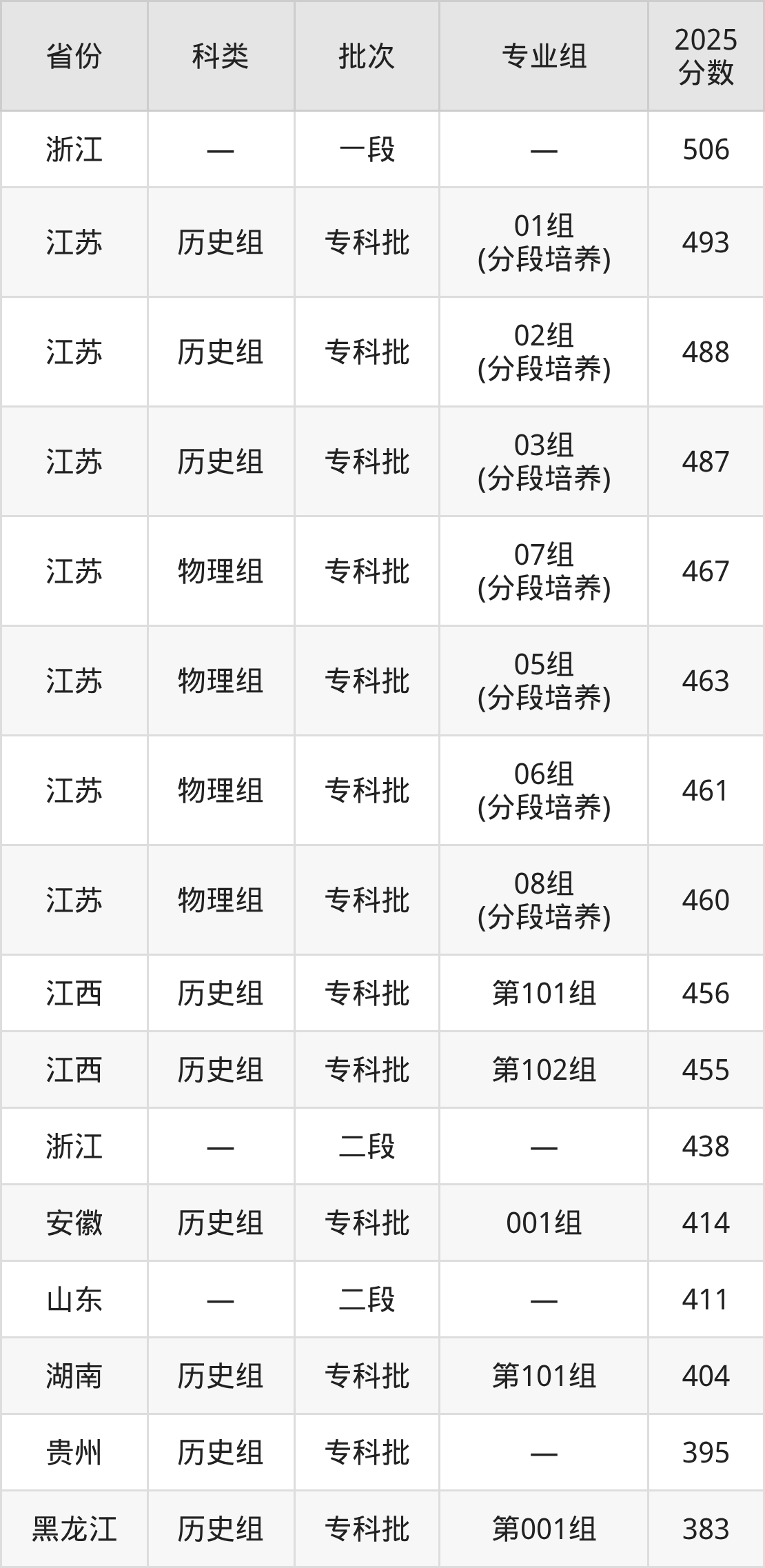 而浙江地区考生的分数门槛最高,2025年盐城幼儿师范高等专科学校在浙江招生最低分为506分,考生至少要超一段线16分才有可能被录取。