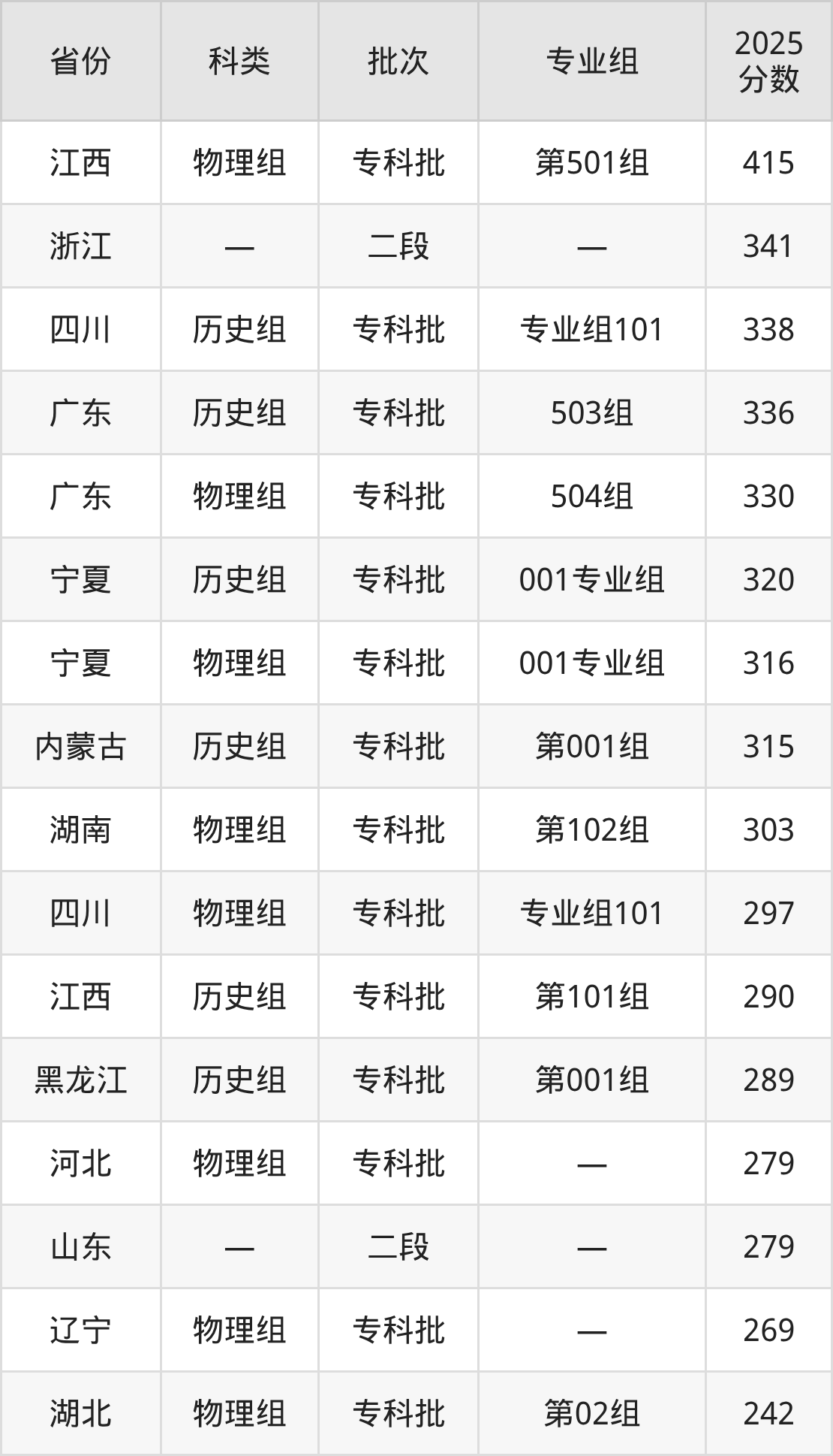 而江西地区物理组考生的分数门槛最高,2025年炎黄职业技术学院第501组在江西招生最低分为415分,考生至少要超专科线175分才有可能被录取。