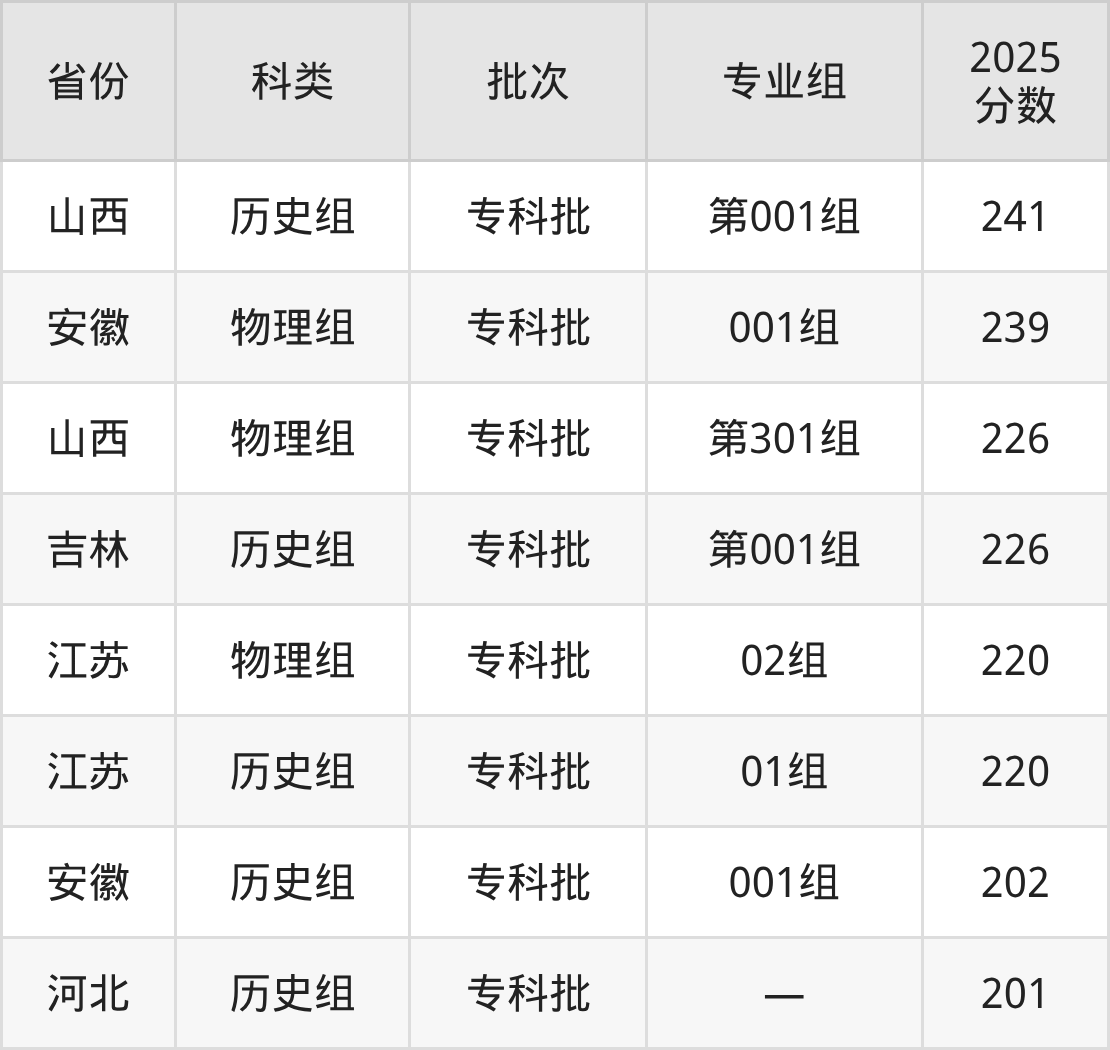 炎黄职业技术学院在省外招生的最低分为201分,其中河北地区历史组考生上炎黄职业技术学院的分数门槛最低,考生成绩超专科线1分(201分)可上。其次是安徽历史组考生,上炎黄职业技术学院至少要超专科线2分(202分)。