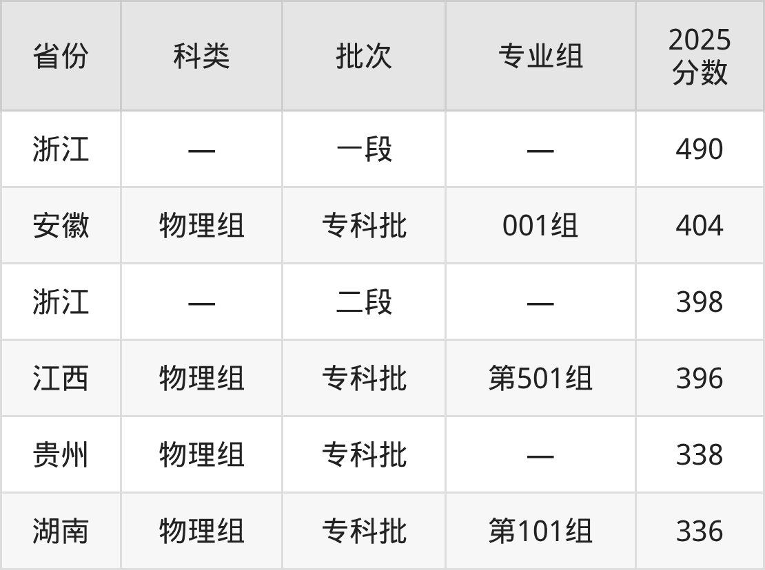 而安徽地区物理组考生的分数门槛最高,2025年浙江汽车职业技术学院001组在安徽招生最低分为404分,考生至少要超专科线204分才有可能被录取。