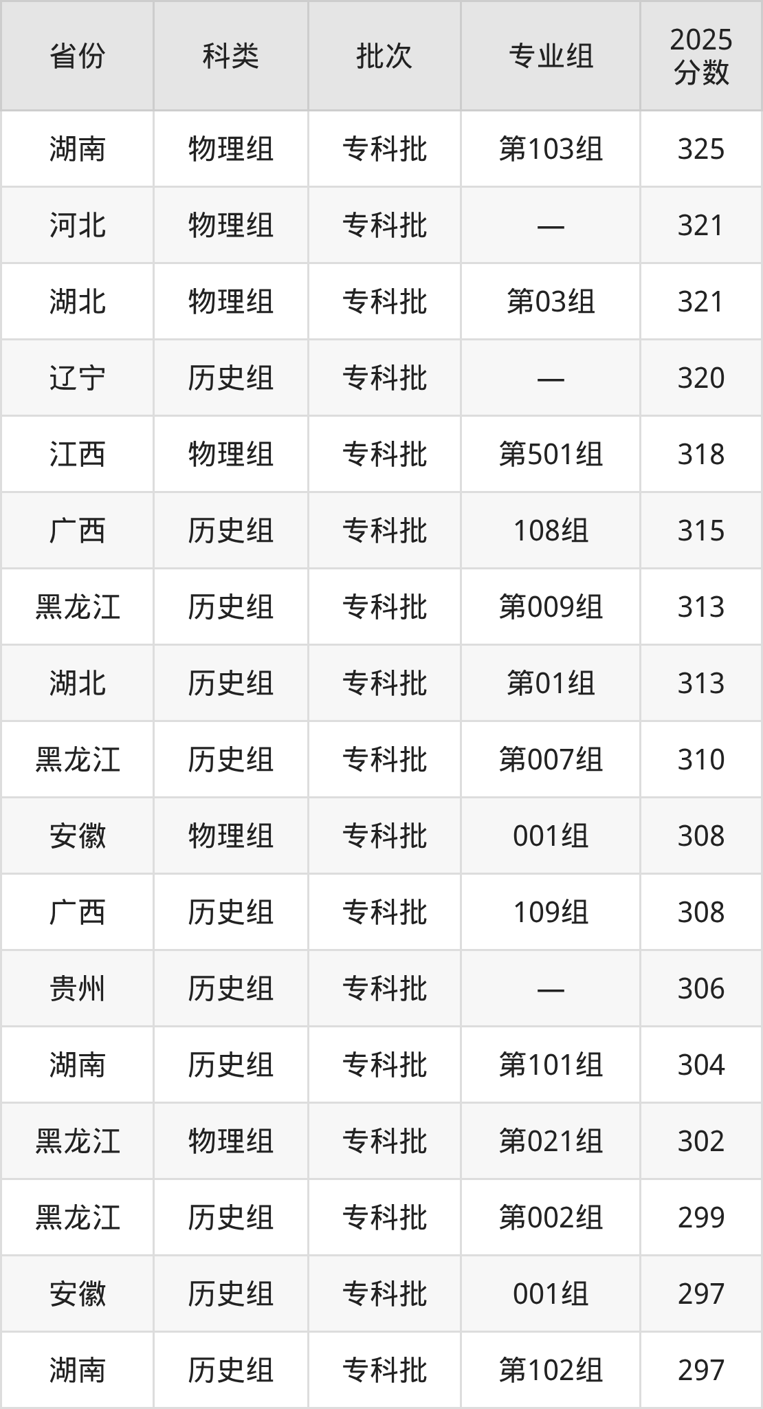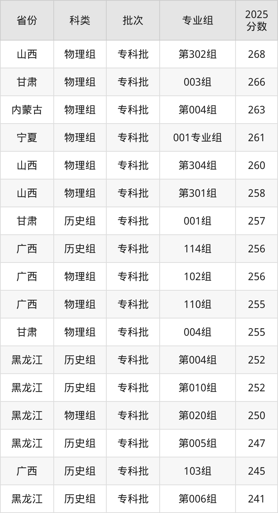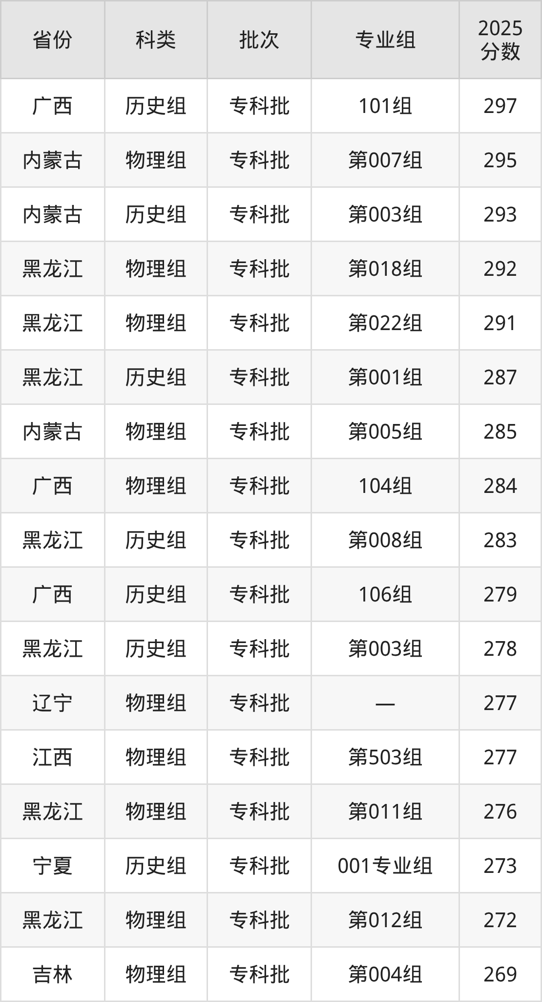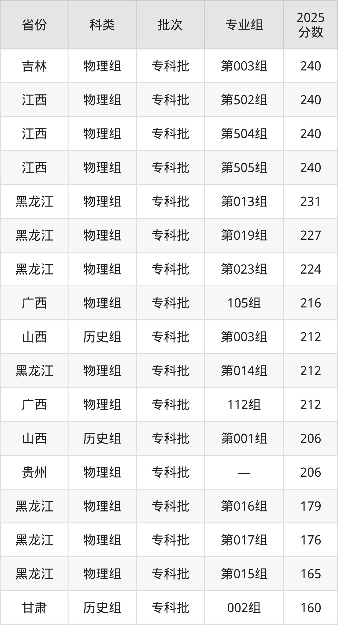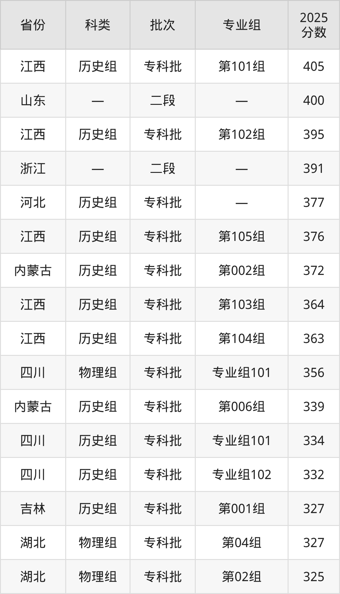 而江西地区历史组考生的分数门槛最高,2025年鹤岗师范高等专科学校第101组在江西招生最低分为405分,考生至少要超专科线115分才有可能被录取。