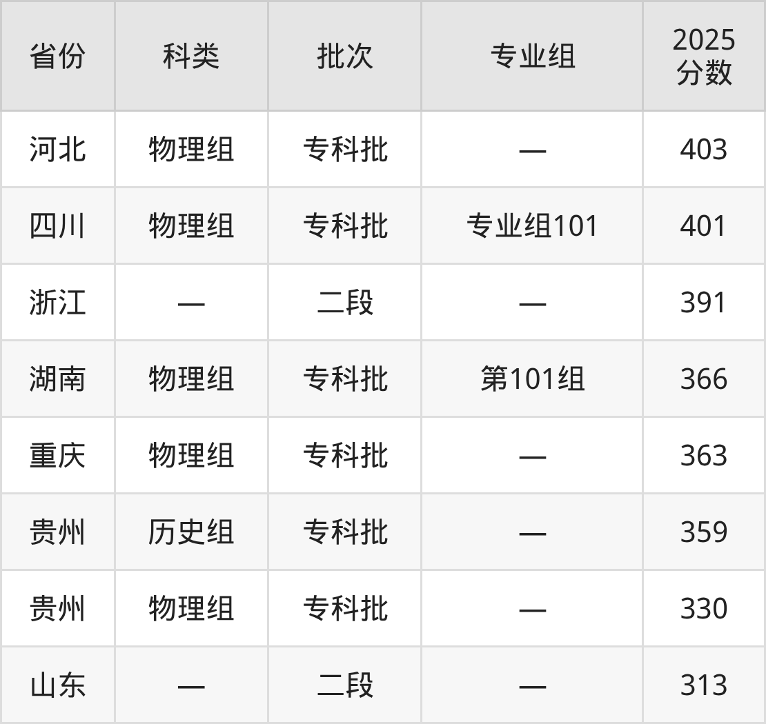下面是贵州工业职业技术学院2025年在全国各省的录取分数线一览表,供参考: