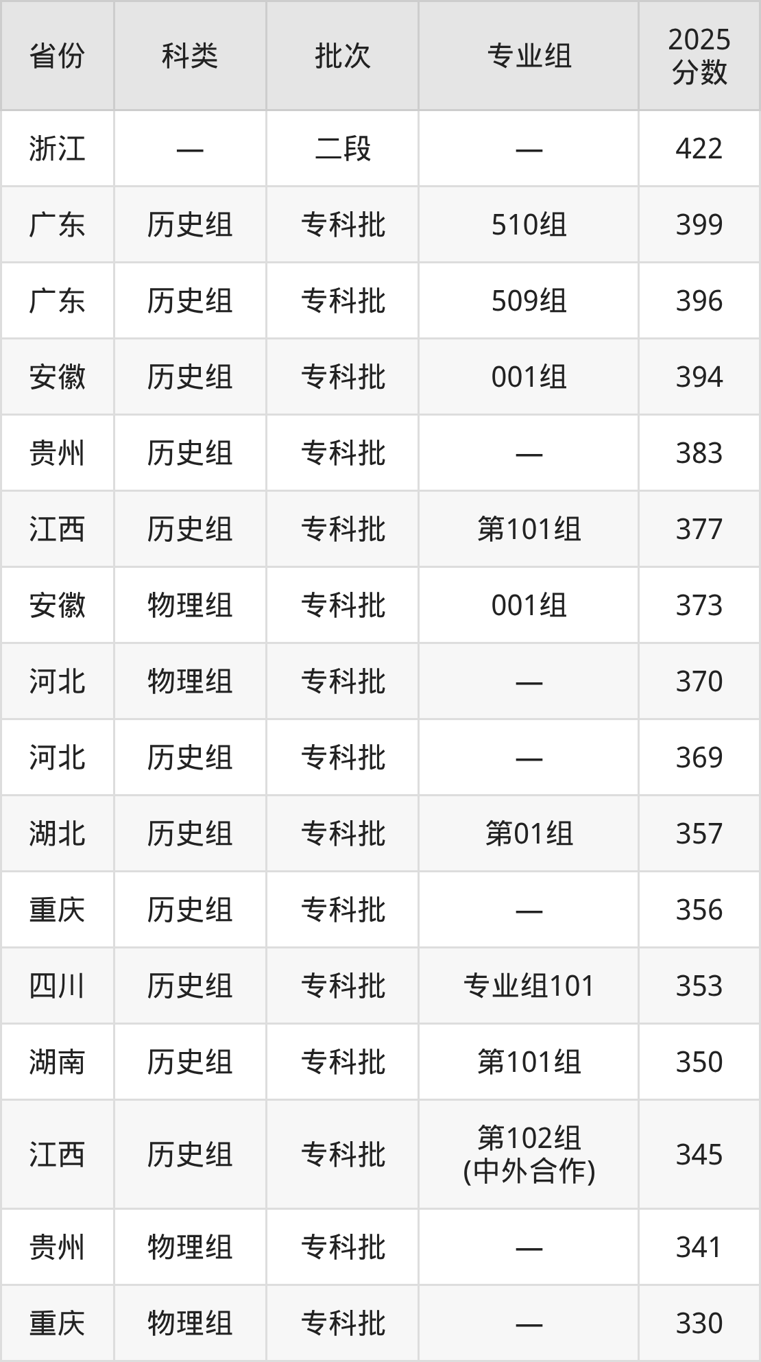而浙江地区考生的分数门槛最高,2025年上饶幼儿师范高等专科学校在浙江招生最低分为422分,考生至少要超二段线154分才有可能被录取。