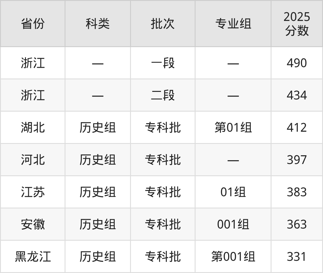 而湖北地区历史组考生的分数门槛最高,2025年绍兴职业技术学院第01组在湖北招生最低分为412分,考生至少要超专科线212分才有可能被录取。