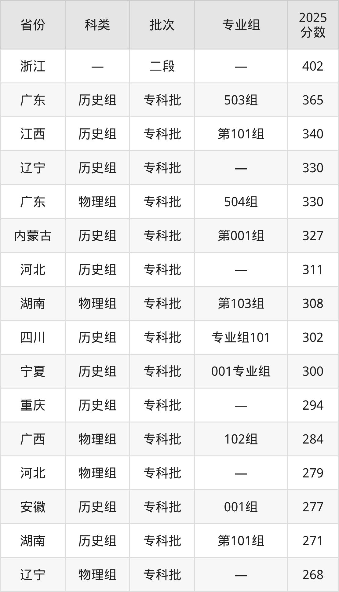 而浙江地区考生的分数门槛最高,2025年江西新能源科技职业学院在浙江招生最低分为402分,考生至少要超二段线134分才有可能被录取。