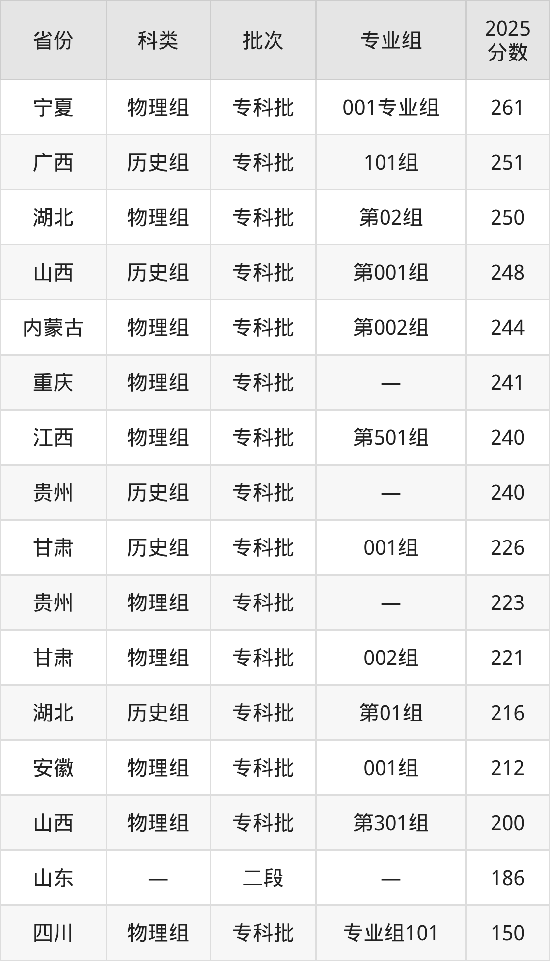 江西新能源科技职业学院在省外招生的最低分为150分,其中四川地区物理组考生上江西新能源科技职业学院的分数门槛最低,考生成绩达专科线即可报考。其次是山东考生,上江西新能源科技职业学院至少要超二段线36分(186分)。