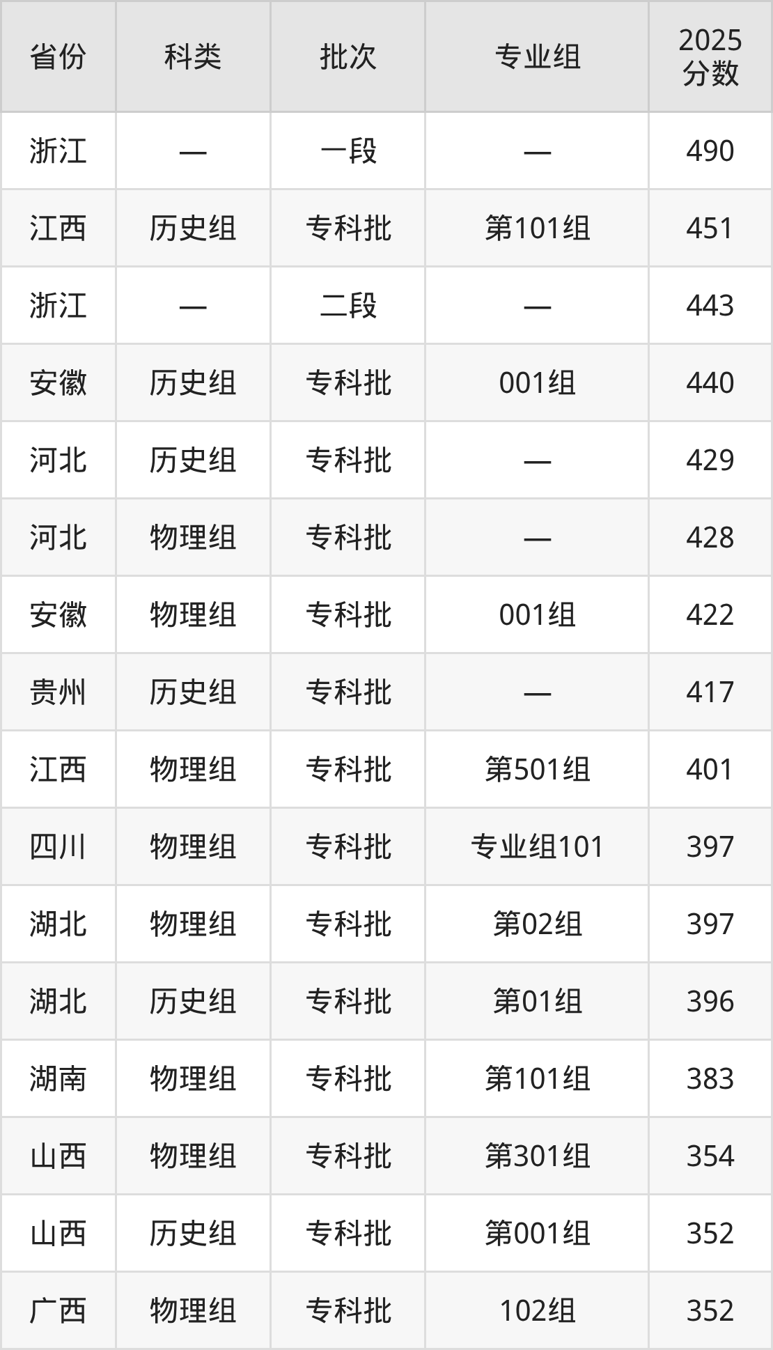 而江西地区历史组考生的分数门槛最高,2025年浙江安防职业技术学院第101组在江西招生最低分为451分,考生至少要超专科线161分才有可能被录取。