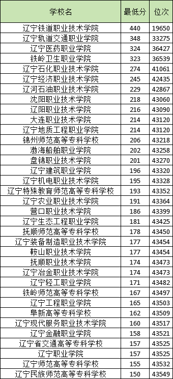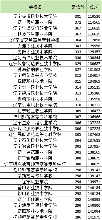 注:本文只整理出辽宁公办专科院校的最低分专业组的录取分数线(不含特殊类型专业/专业组)1.历史类(最低150分)