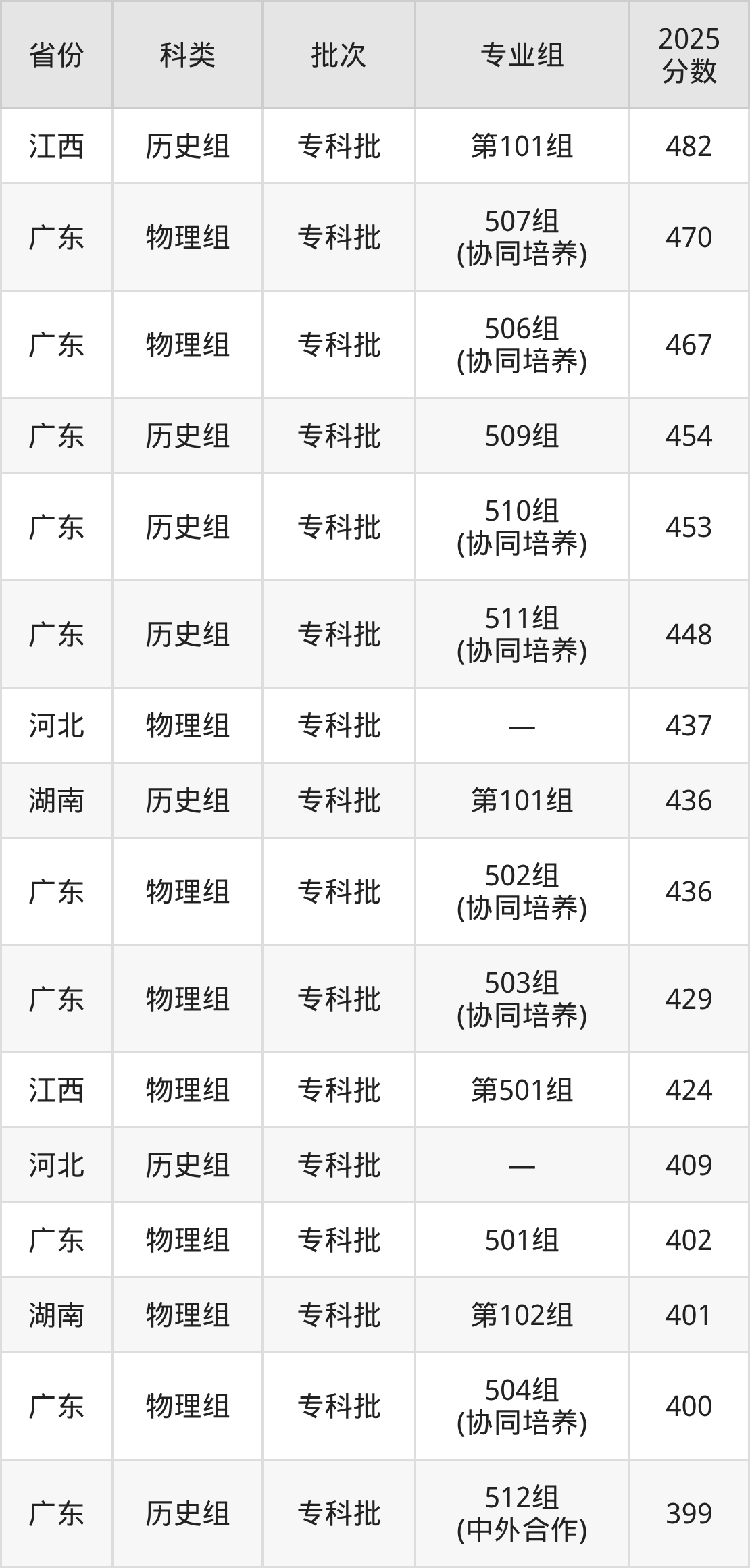 而江西地区历史组考生的分数门槛最高,2025年广东科贸职业学院第101组在江西招生最低分为482分,考生至少要超专科线192分才有可能被录取。