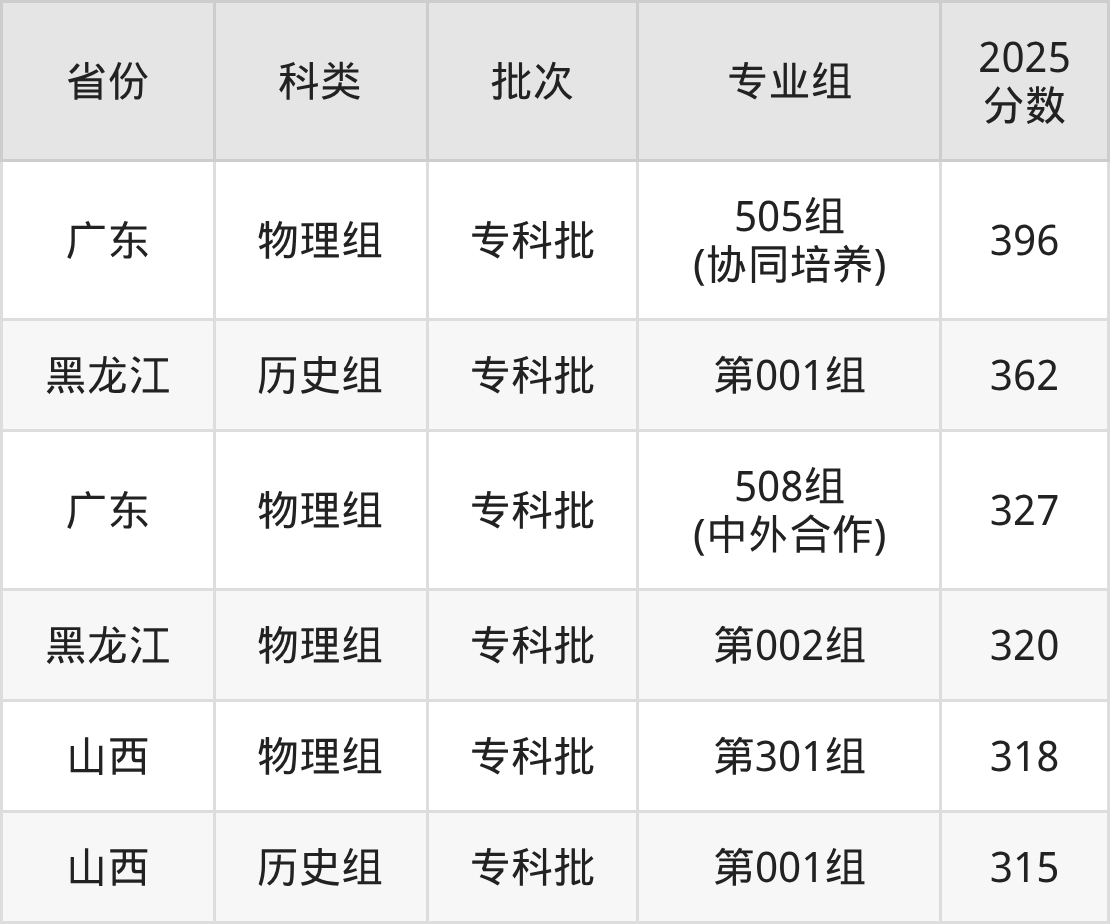 广东科贸职业学院在省外招生的最低分为315分,其中山西地区历史组考生上广东科贸职业学院的分数门槛最低,考生成绩超专科线215分(315分)可上。其次是黑龙江物理组考生,上广东科贸职业学院至少要超专科线160分(320分)。