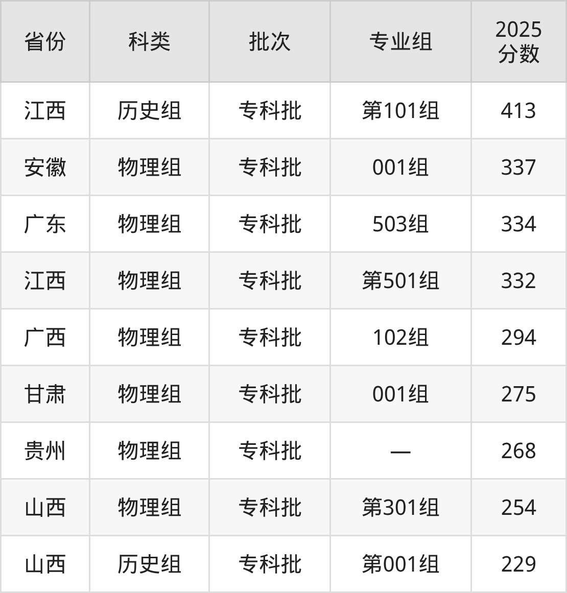 而江西地区历史组考生的分数门槛最高,2025年泉州工艺美术职业学院第101组在江西招生最低分为413分,考生至少要超专科线123分才有可能被录取。
