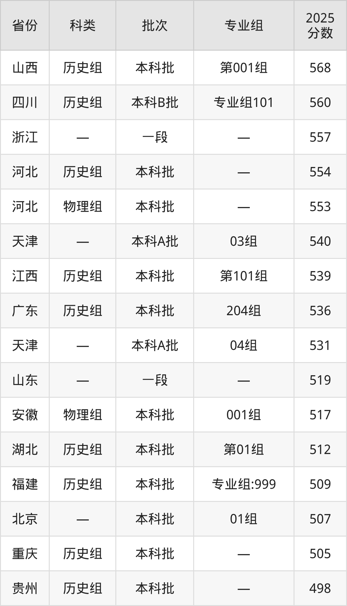 而山西地区历史组考生的分数门槛最高,2025年天津美术学院第001组在山西招生最低分为568分,考生至少要超本科线125分才有可能被录取。