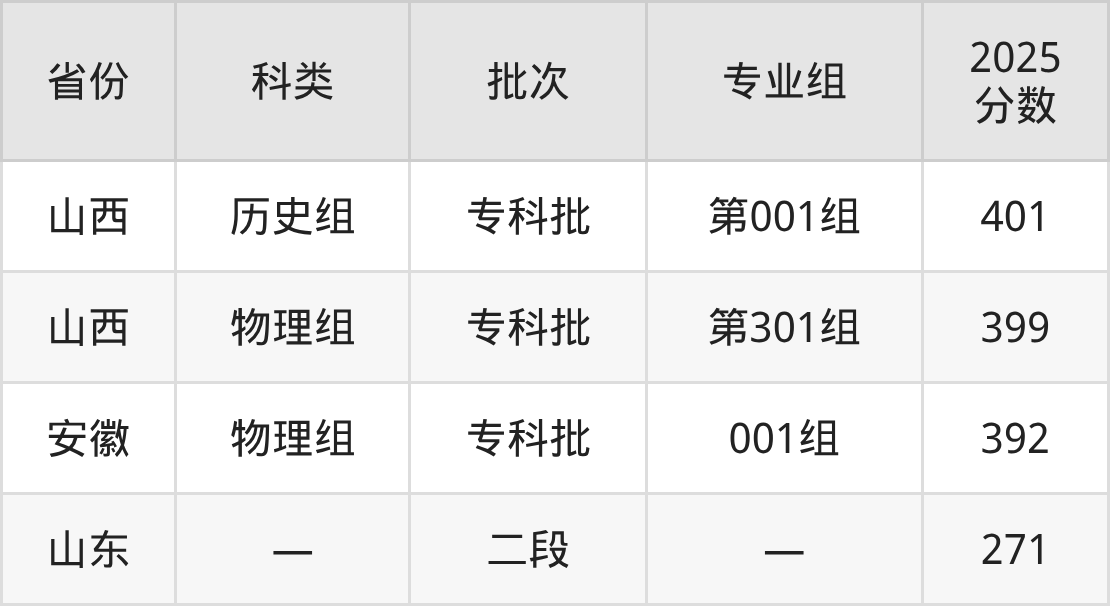 而山西地区历史组考生的分数门槛最高,2025年烟台职业学院第001组在山西招生最低分为401分,考生至少要超专科线301分才有可能被录取。