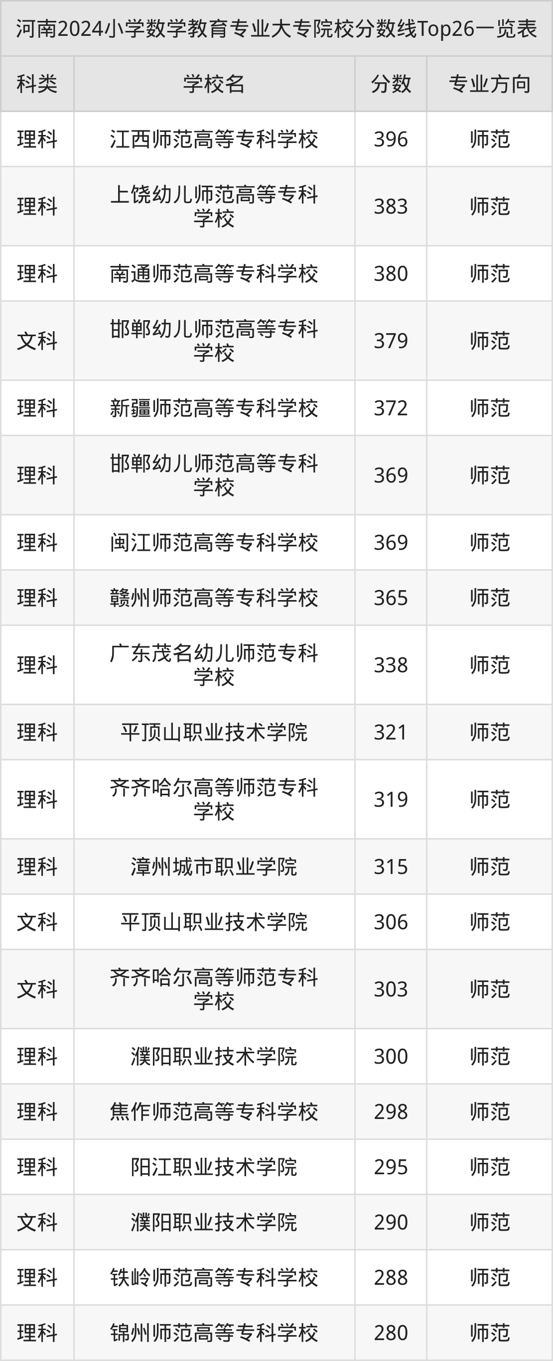 理科最低收分范围在243分~396分之间,其中最低分院校是黑龙江幼儿师范高等专科学校,最高分院校是江西师范高等专科学校。结合上述分析,文科考生比理科考生更容易上小学数学教育大专院校。