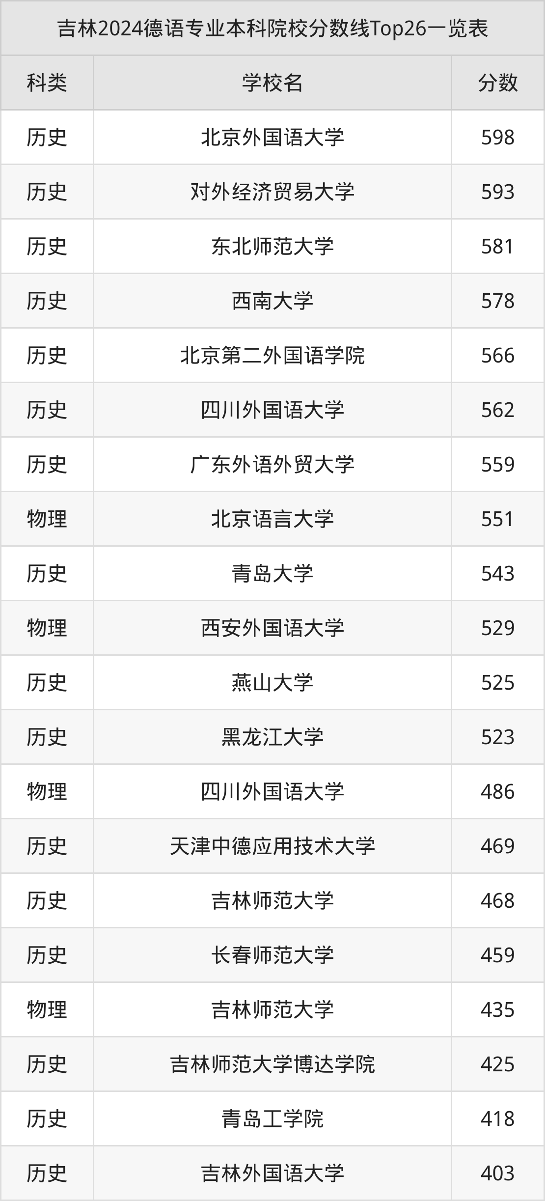 全国本科院校德语专业历史类最低收分范围在384分~598分之间,考生最容易被录取的是吉林外国语大学,分数门槛在本科线上15分。最难被录取的是北京外国语大学,分数门槛在本科线上229分。