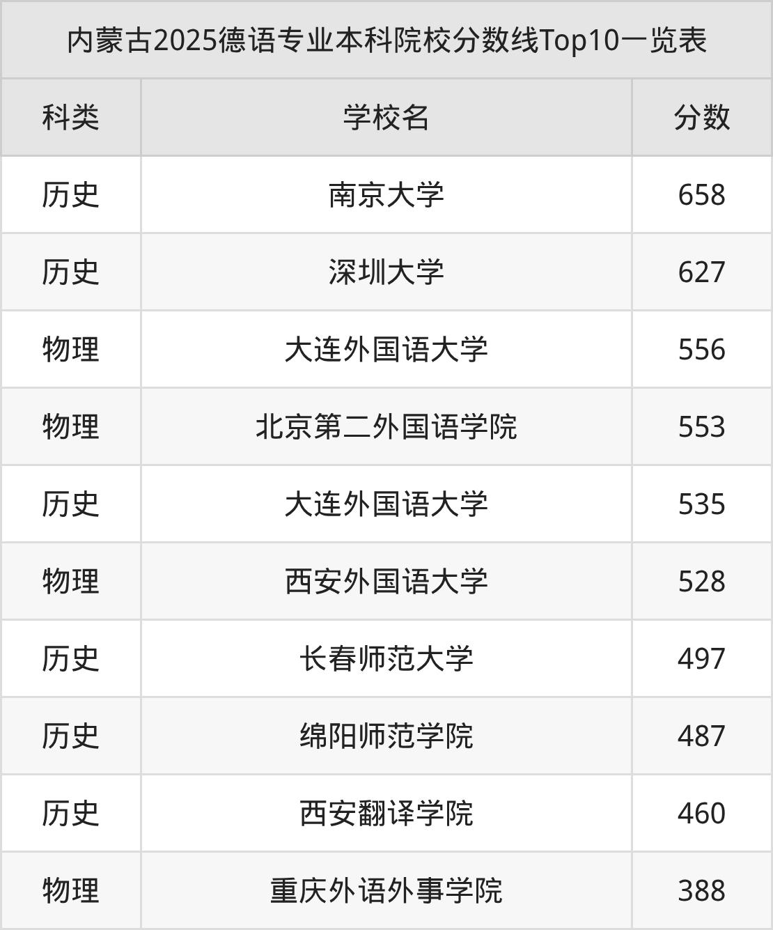 德语专业本科院校实力排名靠前的有上海外国语大学、南京大学、同济大学等。2025年本科德语专业招生最低分数为388分(物理类),而想报考该专业的历史类考生分数至少要在460分以上。