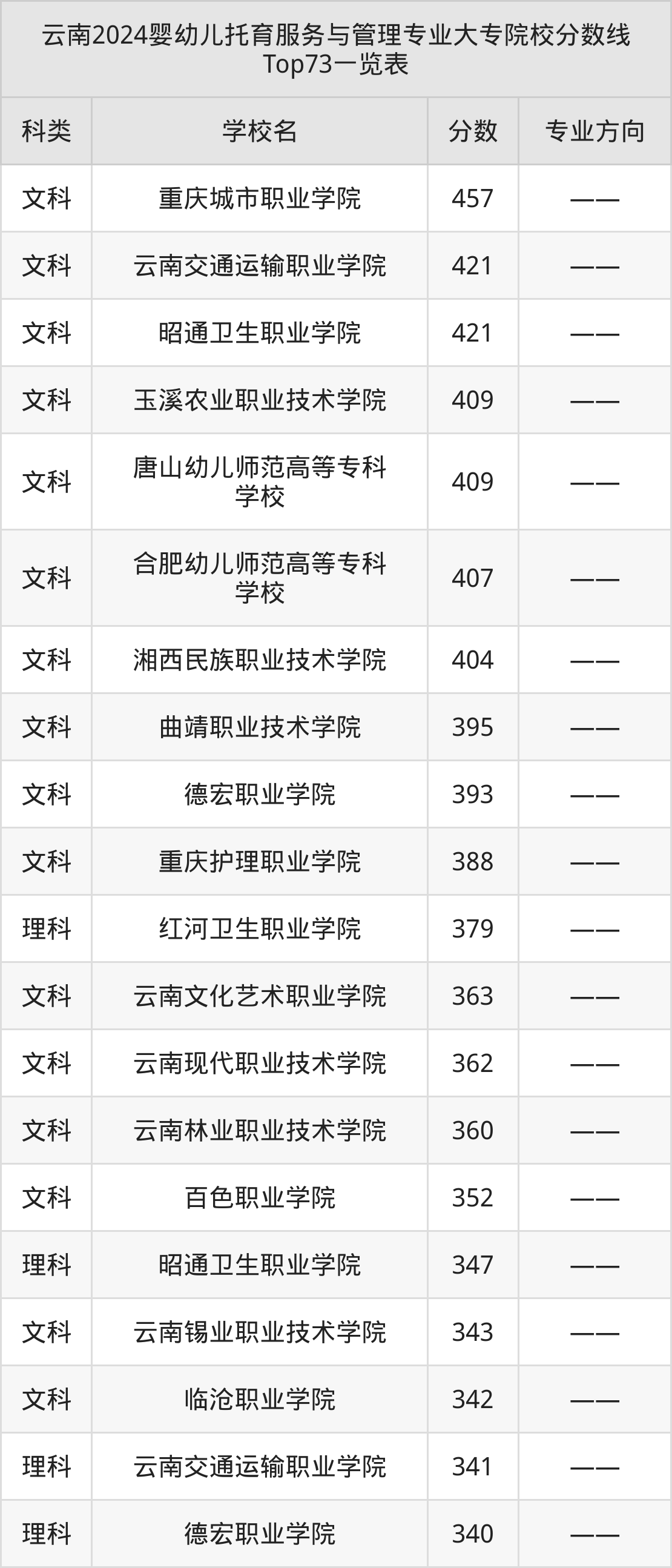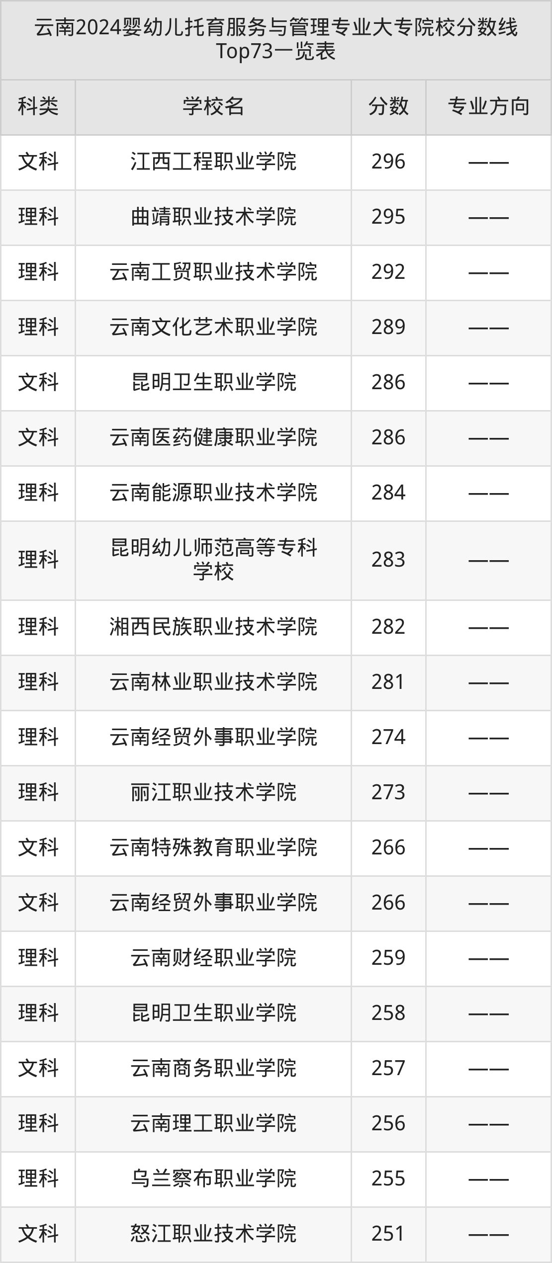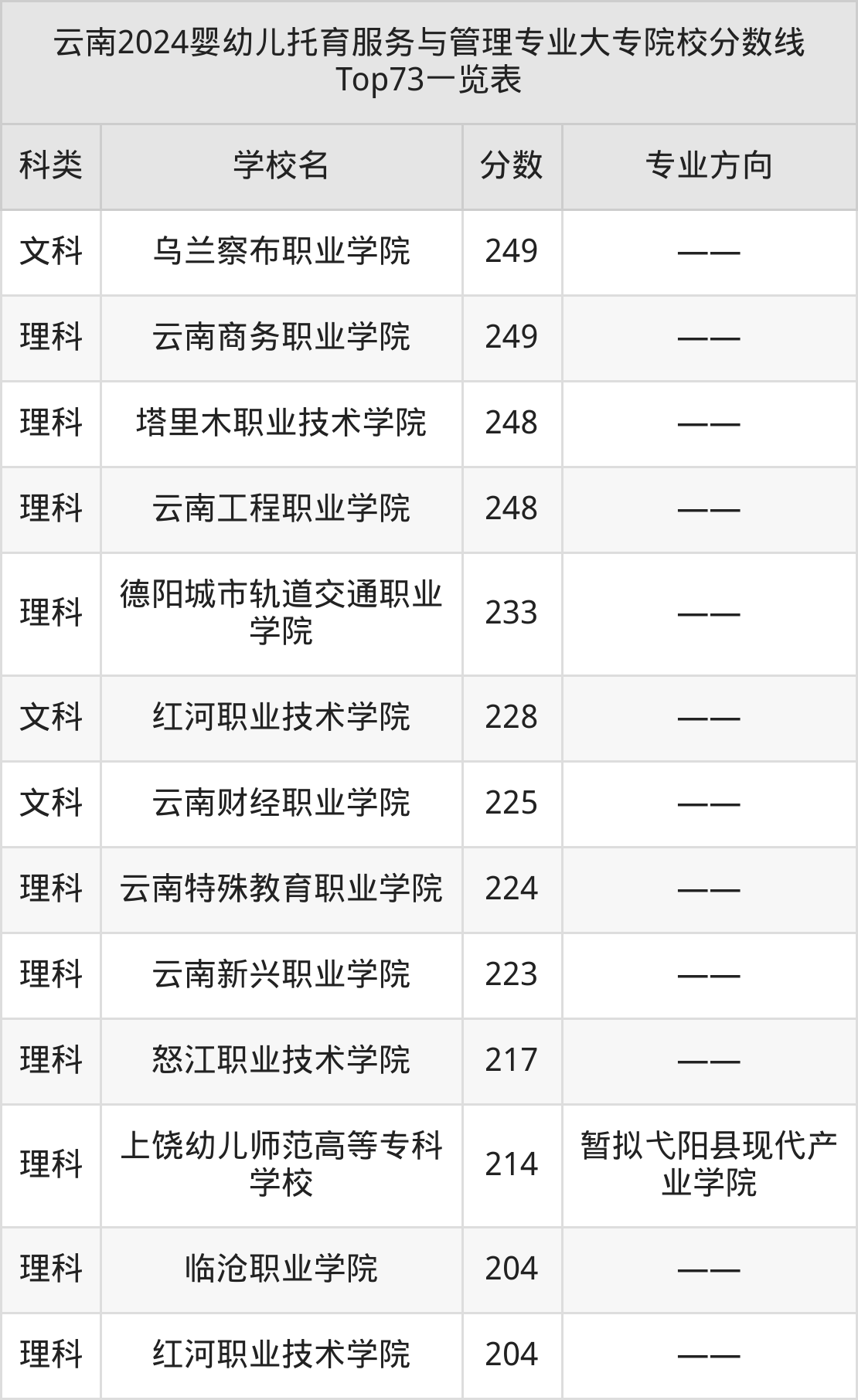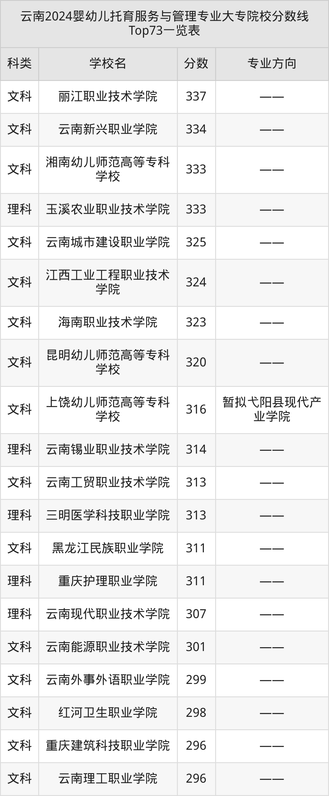 理科最低收分范围在204分~379分之间,其中最低分院校是临沧职业学院,最高分院校是红河卫生职业学院。结合上述分析,理科考生比文科考生更容易上婴幼儿托育服务与管理大专院校。