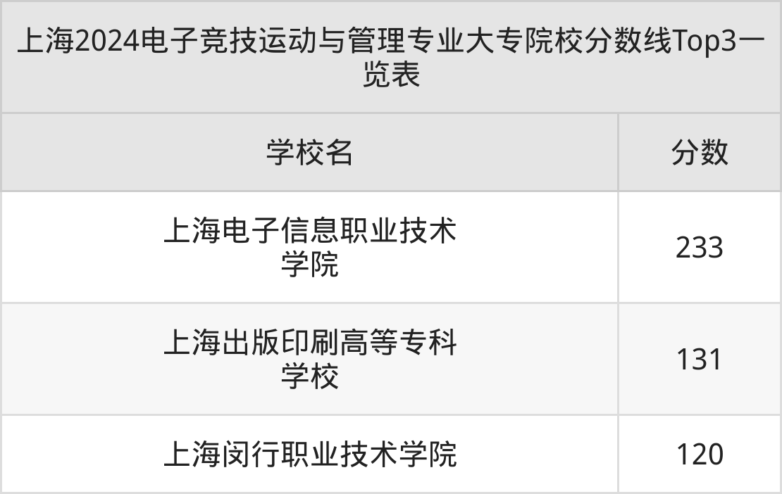 全国大专院校电子竞技运动与管理专业最低收分范围在120分~233分之间,考生最容易被录取的是上海闵行职业技术学院,分数门槛在本科线上120分。最难被录取的是上海电子信息职业技术学院,分数门槛在本科线上233分。