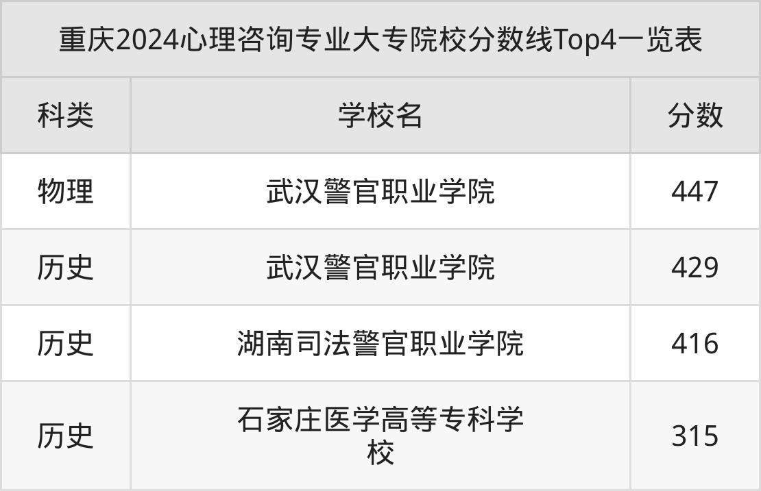 物理类最低收分为447分,对应的招生院校是武汉警官职业学院。结合上述分析,历史类考生比物理类考生更容易上心理咨询大专院校。