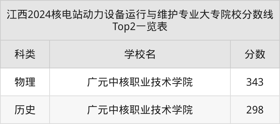 全国大专院校核电站动力设备运行与维护专业历史类最低收分为298分,对应的招生院校是广元中核职业技术学院。