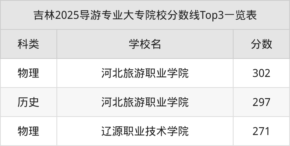 物理类最低收分范围在271分~302分之间,其中最低分院校是辽源职业技术学院,最高分院校是河北旅游职业学院。结合上述分析,物理类考生比历史类考生更容易上导游大专院校。