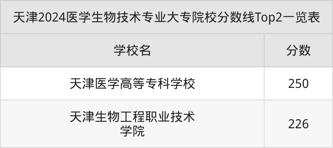 全国大专院校医学生物技术专业最低收分范围在226分~250分之间,考生最容易被录取的是天津生物工程职业技术学院,分数门槛在本科线上226分。最难被录取的是天津医学高等专科学校,分数门槛在本科线上250分。